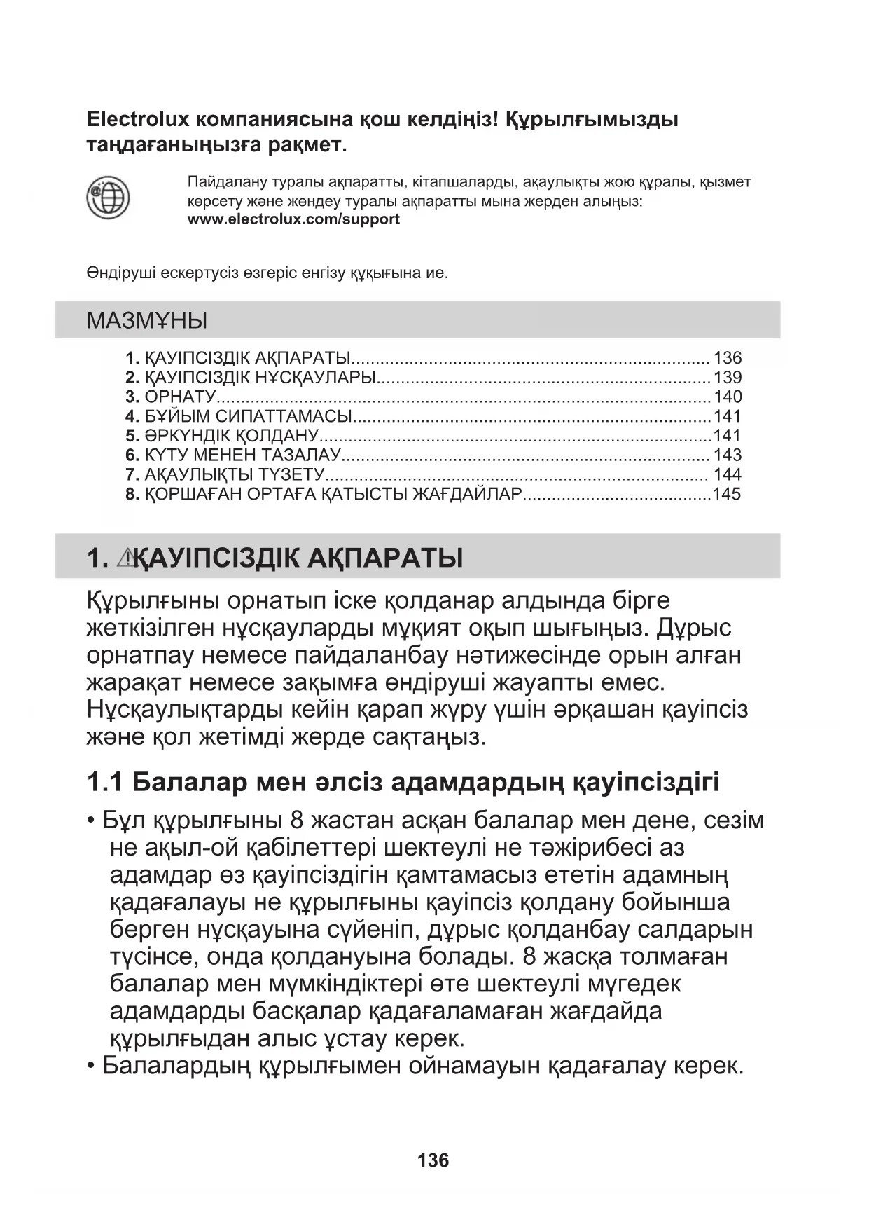 Белгі салынған материалдарды қайта өңдеуден өткізуге тапсырыңыз. Орам материалдарын қайта өңдеуден өткізу үшін тиісті контейнерлерге салыңыз. Электрлік және электроникалық құрылғылардың қалдығын қайта өңдеуден өткізу арқылы, қоршаған ортаға және адамның денсаулығына зиын келтіретін жағдайларға жол бермеуге өз үлесіңізді қосыңыз. Белгі салынған құрылғыларды тұрмыстық қалдықтармен бірге тастамаңыз. Өнімді жергілікті қайта өңдеу орталығына өткізіңіз немесе жергілікті мекемеге хабарласыңыз. 145Sveiki atvykę į „Electrolux“ pasaulį! Dėkojame, kad išsirinkote mūsų prietaisą. Čia rasite naudojimo patarimų, brošiūrų, informacijos apie trikčių šalinimą,aptarnavimą ir remontą:www.electrolux.com/supportGalimi pakeitimai. TURINYS