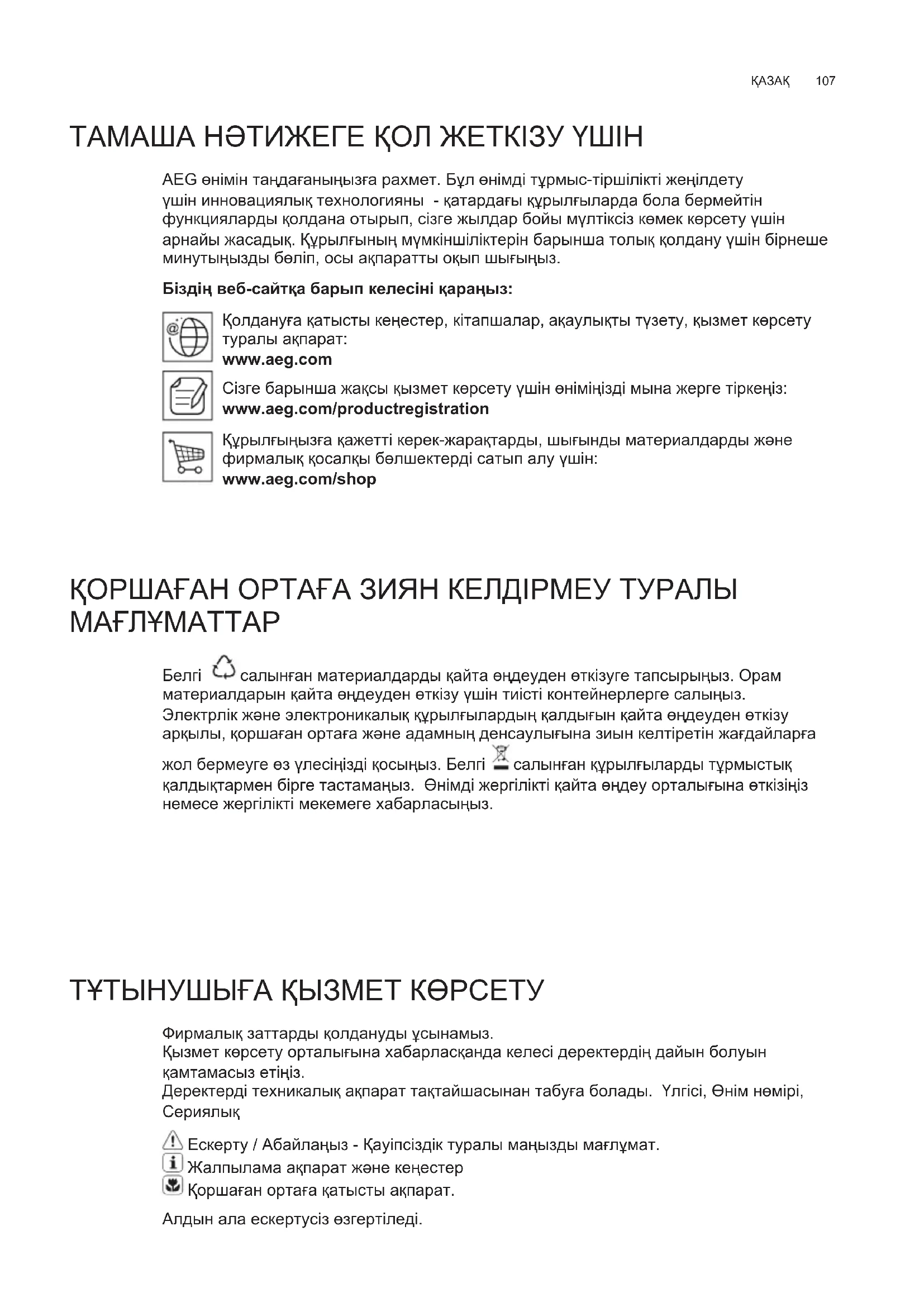 ТАМАША НƏТИЖЕГЕ ҚОЛ ЖЕТКІЗУ ҮШІН AEG өнімін таңдағаныңызға рахмет. Бұл өнімді тұрмыс-тіршілікті жеңілдету үшін инновациялық технологияны - қатардағы құрылғыларда бола бермейтін функцияларды қолдана отырып, сізге жылдар бойы мүлтіксіз көмек көрсету үшін арнайы жасадық. Құрылғының мүмкіншіліктерін барынша толық қолдану үшін бірнеше минутыңызды бөліп, осы ақпаратты оқып шығыңыз. Біздің веб-сайтқа барып келесіні қараңыз: Қолдануға қатысты кеңестер, кітапшалар, ақаулықты түзету, қызмет көрсету туралы ақпарат: www.aeg.com Сізге барынша жақсы қызмет көрсету үшін өніміңізді мына жерге тіркеңіз: www.aeg.com/productregistration Құрылғыңызға қажетті керек-жарақтарды, шығынды материалдарды жəне фирмалық қосалқы бөлшектерді сатып алу үшін: www.aeg.com/shop ҚОРШАҒАН ОРТАҒА ЗИЯН КЕЛДІРМЕУ ТУРАЛЫ МАҒЛҰМАТТАР Белгі салынған материалдарды қайта өңдеуден өткізуге тапсырыңыз. Орам материалдарын қайта өңдеуден өткізу үшін тиісті контейнерлерге салыңыз. Электрлік жəне электроникалық құрылғылардың қалдығын қайта өңдеуден өткізу арқылы, қоршаған ортаға жəне адамның денсаулығына зиын келтіретін жағдайларға жол бермеуге өз үлесіңізді қосыңыз. Белгі салынған құрылғыларды тұрмыстық қалдықтармен бірге тастамаңыз. Өнімді жергілікті қайта өңдеу орталығына өткізіңіз немесе жергілікті мекемеге хабарласыңыз. ТҰТЫНУШЫҒА ҚЫЗМЕТ КӨРСЕТУ Фирмалық заттарды қолдануды ұсынамыз. Қызмет көрсету орталығына хабарласқанда келесі деректердің дайын болуын қамтамасыз етіңіз. Деректерді техникалық ақпарат тақтайшасынан табуға болады. Үлгісі, Өнім нөмірі,