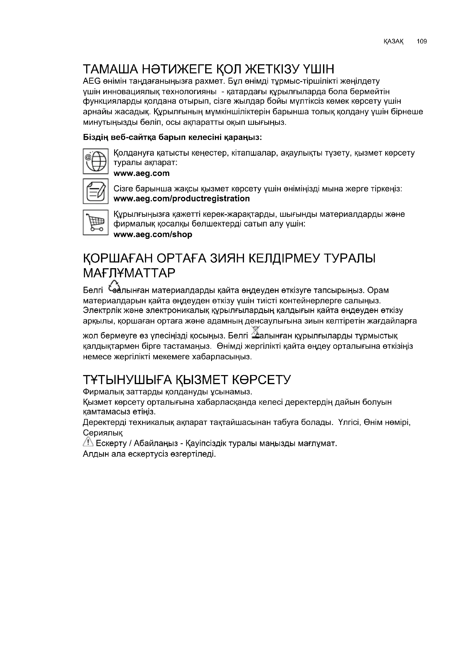 ТАМАША НӘТИЖЕГЕ ҚОЛ ЖЕТКІЗУ ҮШІН AEG өнімін таңдағаныңызға рахмет. Бұл өнімді тұрмыс-тіршілікті жеңілдету үшін инновациялық технологияны - қатардағы құрылғыларда бола бермейтін функцияларды қолдана отырып, сізге жылдар бойы мүлтіксіз көмек көрсету үшін арнайы жасадық. Құрылғының мүмкіншіліктерін барынша толық қолдану үшін бірнеше минутыңызды бөліп, осы ақпаратты оқып шығыңыз. Біздің веб-сайтқа барып келесіні қараңыз: Қолдануға қатысты кеңестер, кітапшалар, ақаулықты түзету, қызмет көрсету туралы ақпарат: www.aeg.com Сізге барынша жақсы қызмет көрсету үшін өніміңізді мына жерге тіркеңіз: www.aeg.com/productregistration Құрылғыңызға қажетті керек-жарақтарды, шығынды материалдарды және фирмалық қосалқы бөлшектерді сатып алу үшін: www.aeg.com/shop ҚОРШАҒАН ОРТАҒА ЗИЯН КЕЛДІРМЕУ ТУРАЛЫ МАҒЛҰМАТТАР Белгі салынған материалдарды қайта өңдеуден өткізуге тапсырыңыз. Орам материалдарын қайта өңдеуден өткізу үшін тиісті контейнерлерге салыңыз. Электрлік және электроникалық құрылғылардың қалдығын қайта өңдеуден өткізу арқылы, қоршаған ортаға және адамның денсаулығына зиын келтіретін жағдайларға жол бермеуге өз үлесіңізді қосыңыз. Белгі салынған құрылғыларды тұрмыстық қалдықтармен бірге тастамаңыз. Өнімді жергілікті қайта өңдеу орталығына өткізіңіз немесе жергілікті мекемеге хабарласыңыз. ТҰТЫНУШЫҒА ҚЫЗМЕТ КӨРСЕТУ Фирмалық заттарды қолдануды ұсынамыз. Қызмет көрсету орталығына хабарласқанда келесі деректердің дайын болуын қамтамасыз етіңіз. Деректерді техникалық ақпарат тақтайшасынан табуға болады. Үлгісі, Өнім нөмірі,