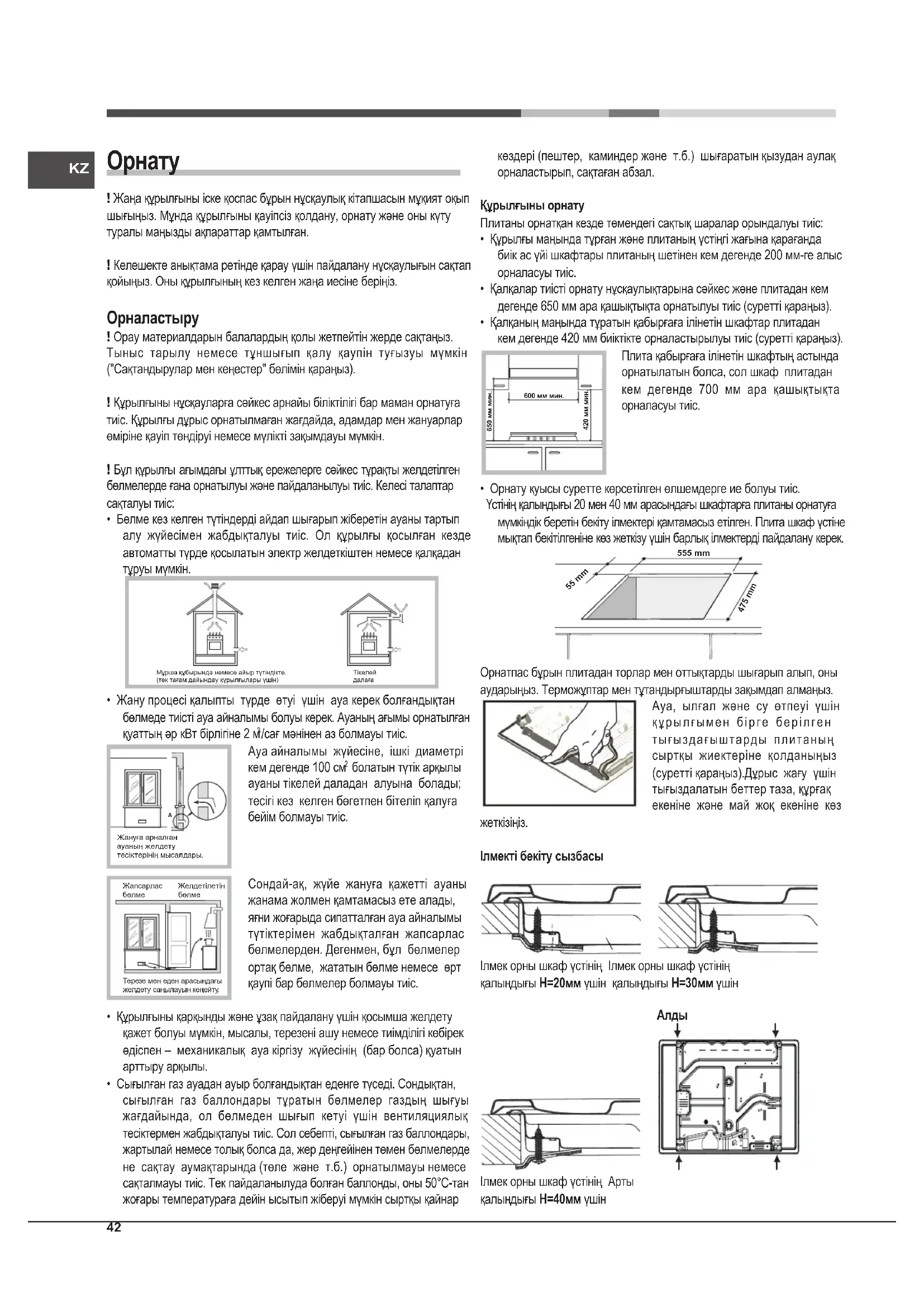 - Газ құрылғылары тиімді жұмыс істеуі үшін тұрақты ауа алмасуын қажет етеді. Плитаны орнату кезінде құрылғы "Орналастыру" параграфында берілген нұсқауларды орындаңыз.