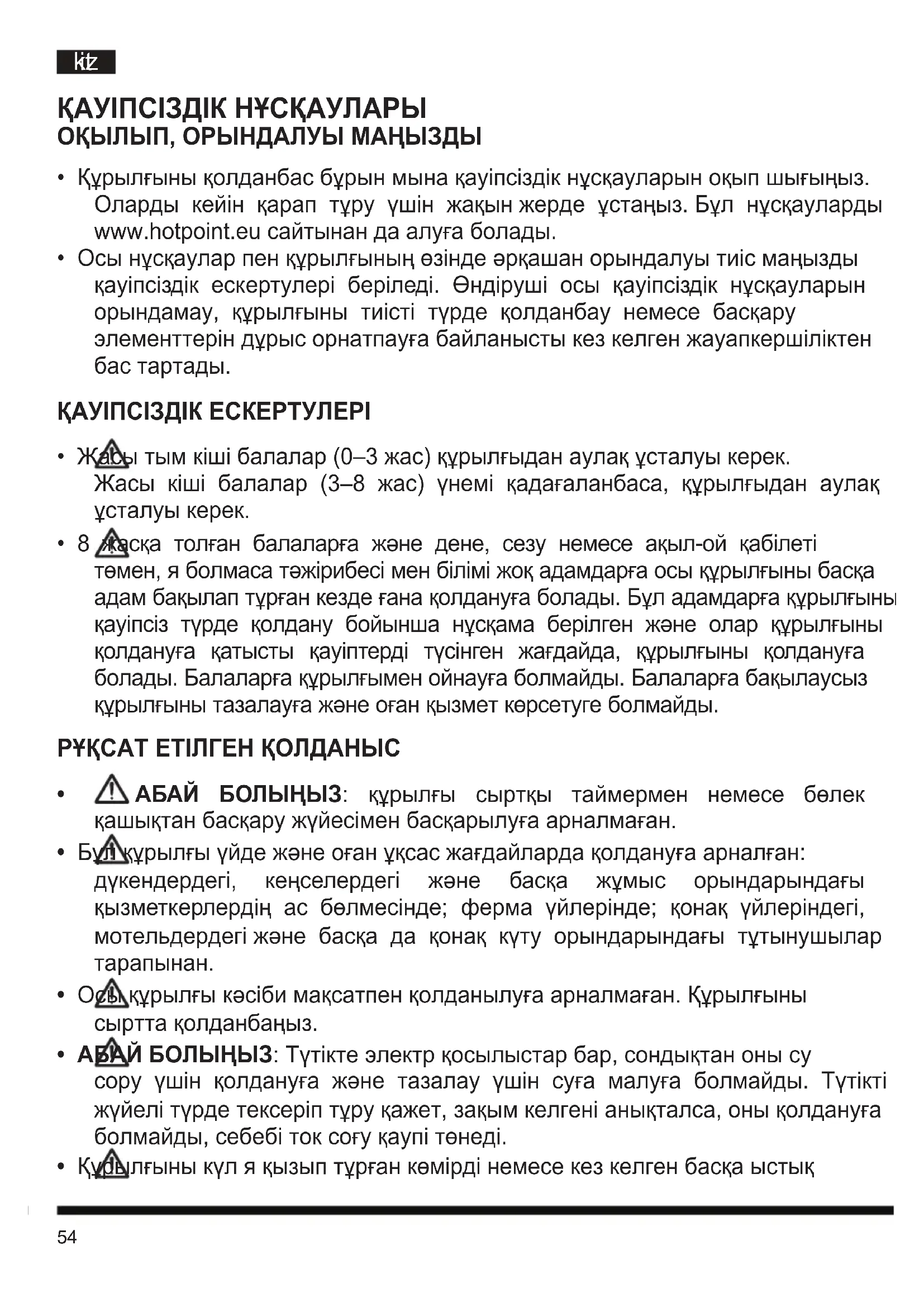 - Құрылғыны қолданбас бұрын мына қауіпсіздік нұсқауларын оқып шығыңыз. Оларды кейін қарап тұру үшін жақын жерде ұстаңыз. Бұл нұсқауларды www.hotpoint.eu сайтынан да алуға болады.