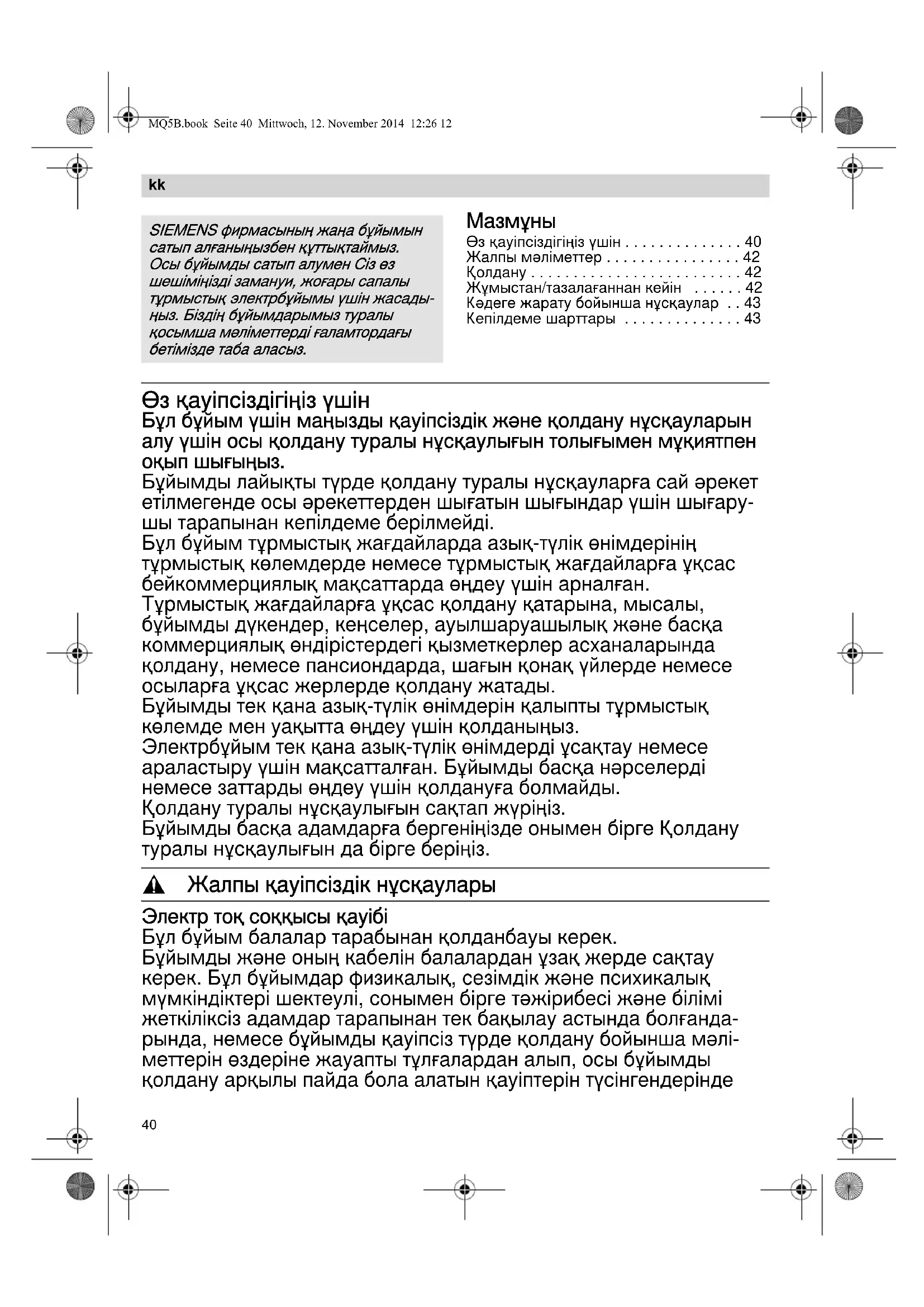 - Кепілдеме шарттары Өз қауіпсіздігіңіз үшін Бұл бұйым үшін маңызды қауіпсіздік және қолдану нұсқауларын алу үшін осы қолдану туралы нұсқаулығын толығымен мұқиятпен оқып шығыңыз. Бұйымды лайықты түрде қолдану туралы нұсқауларға сай әрекет етілмегенде осы әрекеттерден шығатын шығындар үшін шығару- шы тарапынан кепілдеме берілмейді. Бұл бұйым тұрмыстық жағдайларда азық-түлік өнімдерінің тұрмыстық көлемдерде немесе тұрмыстық жағдайларға ұқсас бейкоммерциялық мақсаттарда өңдеу үшін арналған. Тұрмыстық жағдайларға ұқсас қолдану қатарына, мысалы, бұйымды дүкендер, кеңселер, ауылшаруашылық және басқа коммерциялық өндірістердегі қызметкерлер асханаларында қолдану, немесе пансиондарда, шағын қонақ үйлерде немесе осыларға ұқсас жерлерде қолдану жатады. Бұйымды тек қана азық-түлік өнімдерін қалыпты тұрмыстық көлемде мен уақытта өңдеу үшін қолданыңыз. Электрбұйым тек қана азық-түлік өнімдерді ұсақтау немесе араластыру үшін мақсатталған. Бұйымды басқа нәрселерді немесе заттарды өңдеу үшін қолдануға болмайды. Қолдану туралы нұсқаулығын сақтап жүріңіз. Бұйымды басқа адамдарға бергеніңізде онымен бірге Қолдану туралы нұсқаулығын да бірге беріңіз. , Жалпы қауіпсіздік нұсқаулары Электр тоқ соққысы қауібі Бұл бұйым балалар тарабынан қолданбауы керек. Бұйымды және оның кабелін балалардан ұзақ жерде сақтау керек. Бұл бұйымдар физикалық, сезімдік және психикалық мүмкіндіктері шектеулі, сонымен бірге тәжірибесі және білімі жеткіліксіз адамдар тарапынан тек бақылау астында болғанда- рында, немесе бұйымды қауіпсіз түрде қолдану бойынша мәлі- меттерін өздеріне жауапты тұлғалардан алып, осы бұйымды қолдану арқылы пайда бола алатын қауіптерін түсінгендерінде SIEMENS фирмасының жаңа бұйымын сатып алғаныңызбен құттықтаймыз. Осы бұйымды сатып алумен Сіз өз шешіміңізді замануи, жоғары сапалы тұрмыстық электрбұйымы үшін жасады- ңыз. Біздің бұйымдарымыз туралы қосымша мәліметтерді ғаламтордағы бетімізде таба аласыз. MQ5B.book Seite 40 Mittwoch, 12. November 2014 12:26 1241 p. 43