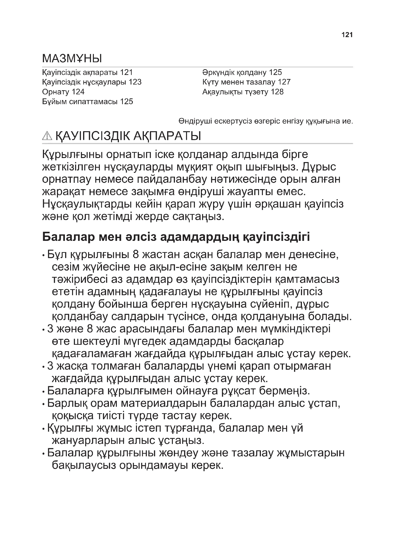 - Балалар құрылғыны жөндеу және тазалау жұмыстарын бақылаусыз орындамауы керек. 121Қауіпсіздік туралы жалпы ақпарат