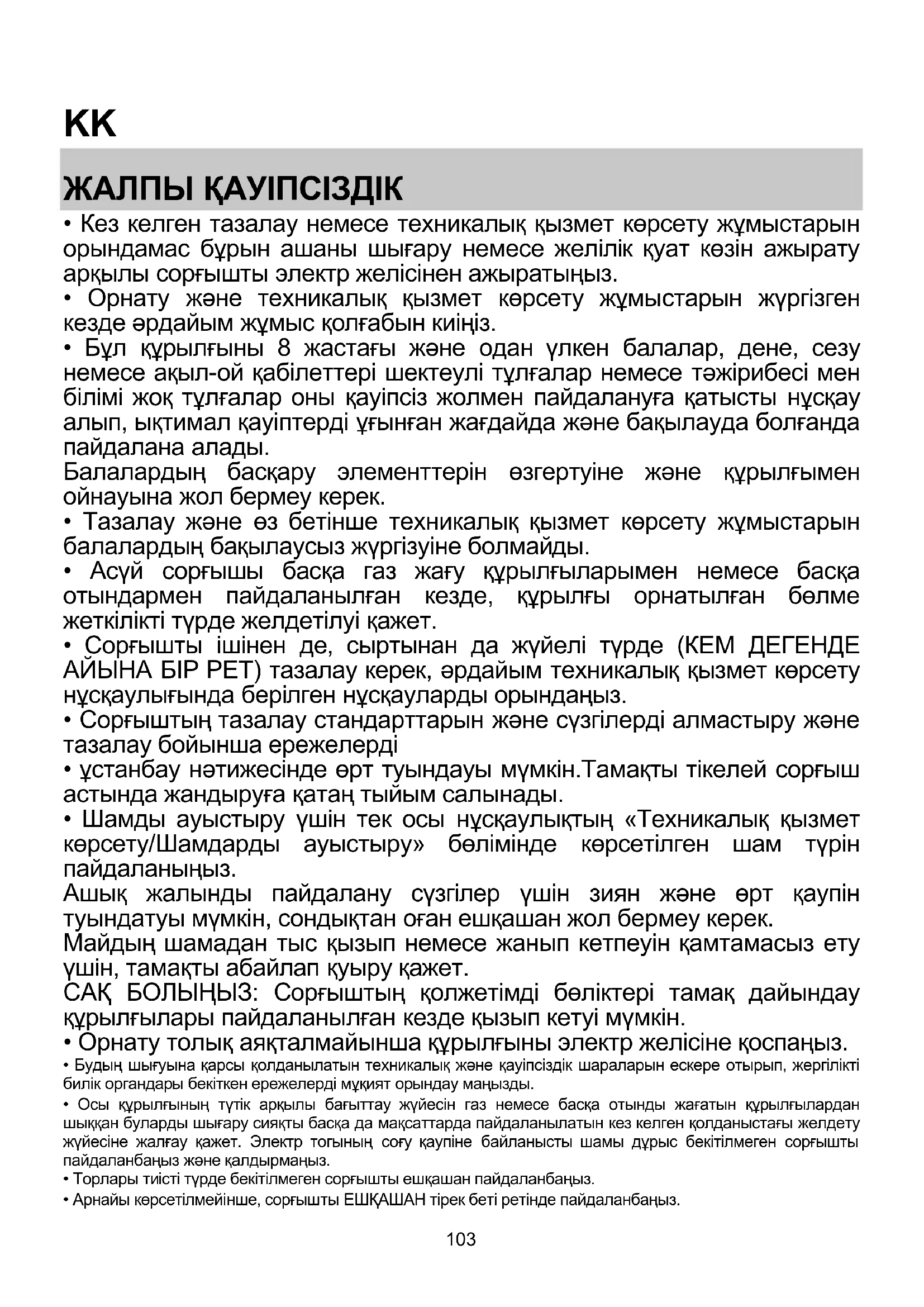 - Тазалау жəне өз бетінше техникалық қызмет көрсету жұмыстарын балалардың бақылаусыз жүргізуіне болмайды.
