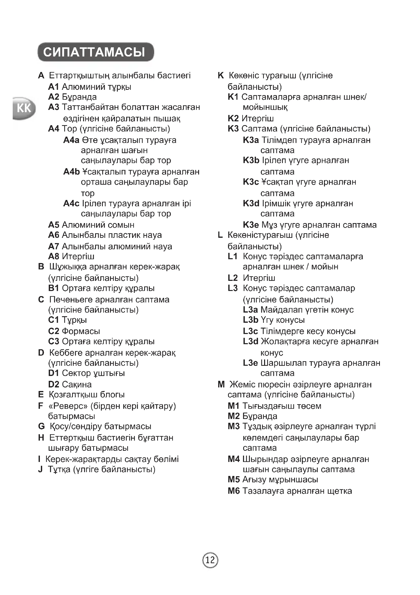 G Қосу/сөндіру батырмасы H Еттертқыш бастиегін бұғаттан шығару батырмасы I Керек-жарақтарды сақтау бөлімі J Тұтқа (үлгіге байланысты) K Көкөніс турағыш (үлгісіне байланысты) K1 Саптамаларға арналған шнек/