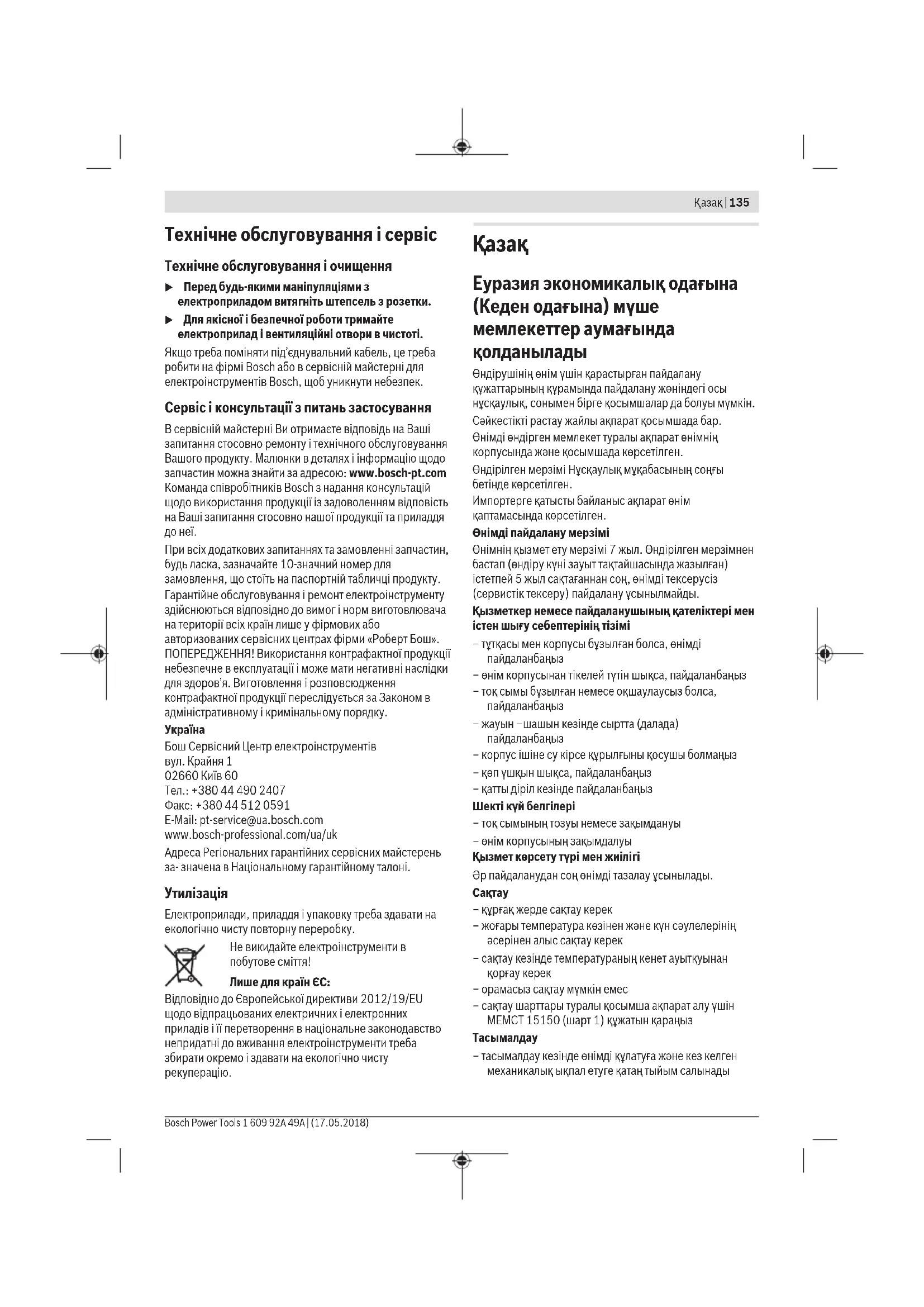 Муратбаев к., 180 үй “Гермес” БО, 7 қабат Тел.: +7 (727) 331 31 00 Факс: +7 (727) 233 07 87 E-Mail: ptka@bosch.com Сервистік қызмет көрсету орталықтары мен қабылдау пунктерінің мекен-жайы туралы толық және өзекті ақпаратты Сіз: www.bosch-professional.kz ресми сайттан