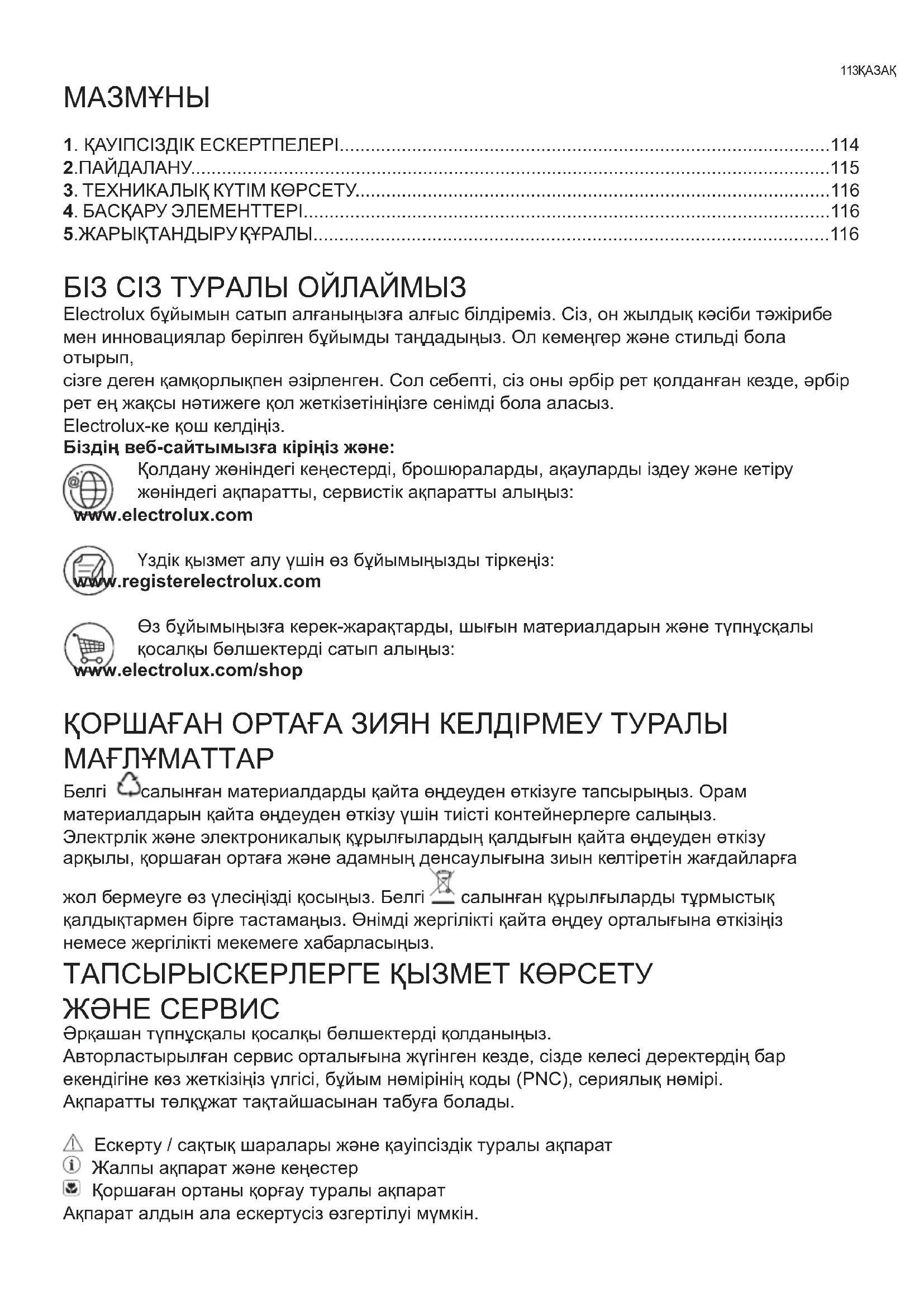 сізге деген қамқорлықпен əзірленген. Сол себепті, сіз оны əрбір рет қолданған кезде, əрбір рет ең жақсы нəтижеге қол жеткізетініңізге сенімді бола аласыз. Electrolux-ке қош келдіңіз. Біздің веб-сайтымызға кіріңіз жəне: Қолдану жөніндегі кеңестерді, брошюраларды, ақауларды іздеу жəне кетіру жөніндегі ақпаратты, сервистік ақпаратты алыңыз: www.electrolux.com Үздік қызмет алу үшін өз бұйымыңызды тіркеңіз: www.registerelectrolux.com Өз бұйымыңызға керек-жарақтарды, шығын материалдарын жəне түпнұсқалы қосалқы бөлшектерді сатып алыңыз: www.electrolux.com/shop ҚОРШАҒАН ОРТАҒА ЗИЯН КЕЛДІРМЕУ ТУРАЛЫ МАҒЛҰМАТТАР Белгі салынған материалдарды қайта өңдеуден өткізуге тапсырыңыз. Орам материалдарын қайта өңдеуден өткізу үшін тиісті контейнерлерге салыңыз. Электрлік жəне электроникалық құрылғылардың қалдығын қайта өңдеуден өткізу арқылы, қоршаған ортаға жəне адамның денсаулығына зиын келтіретін жағдайларға жол бермеуге өз үлесіңізді қосыңыз. Белгі салынған құрылғыларды тұрмыстық қалдықтармен бірге тастамаңыз. Өнімді жергілікті қайта өңдеу орталығына өткізіңіз немесе жергілікті мекемеге хабарласыңыз. ТАПСЫРЫСКЕРЛЕРГЕ ҚЫЗМЕТ КӨРСЕТУ ЖƏНЕ СЕРВИС Əрқашан түпнұсқалы қосалқы бөлшектерді қолданыңыз. Авторластырылған сервис орталығына жүгінген кезде, сізде келесі деректердің бар екендігіне көз жеткізіңіз үлгісі, бұйым нөмірінің коды (PNC), сериялық нөмірі. Ақпаратты төлқұжат тақтайшасынан табуға болады. Ескерту / сақтық шаралары жəне қауіпсіздік туралы ақпарат Жалпы ақпарат жəне кеңестер Қоршаған ортаны қорғау туралы ақпарат Ақпарат алдын ала ескертусіз өзгертілуі мүмкін.114 www.electrolux.com