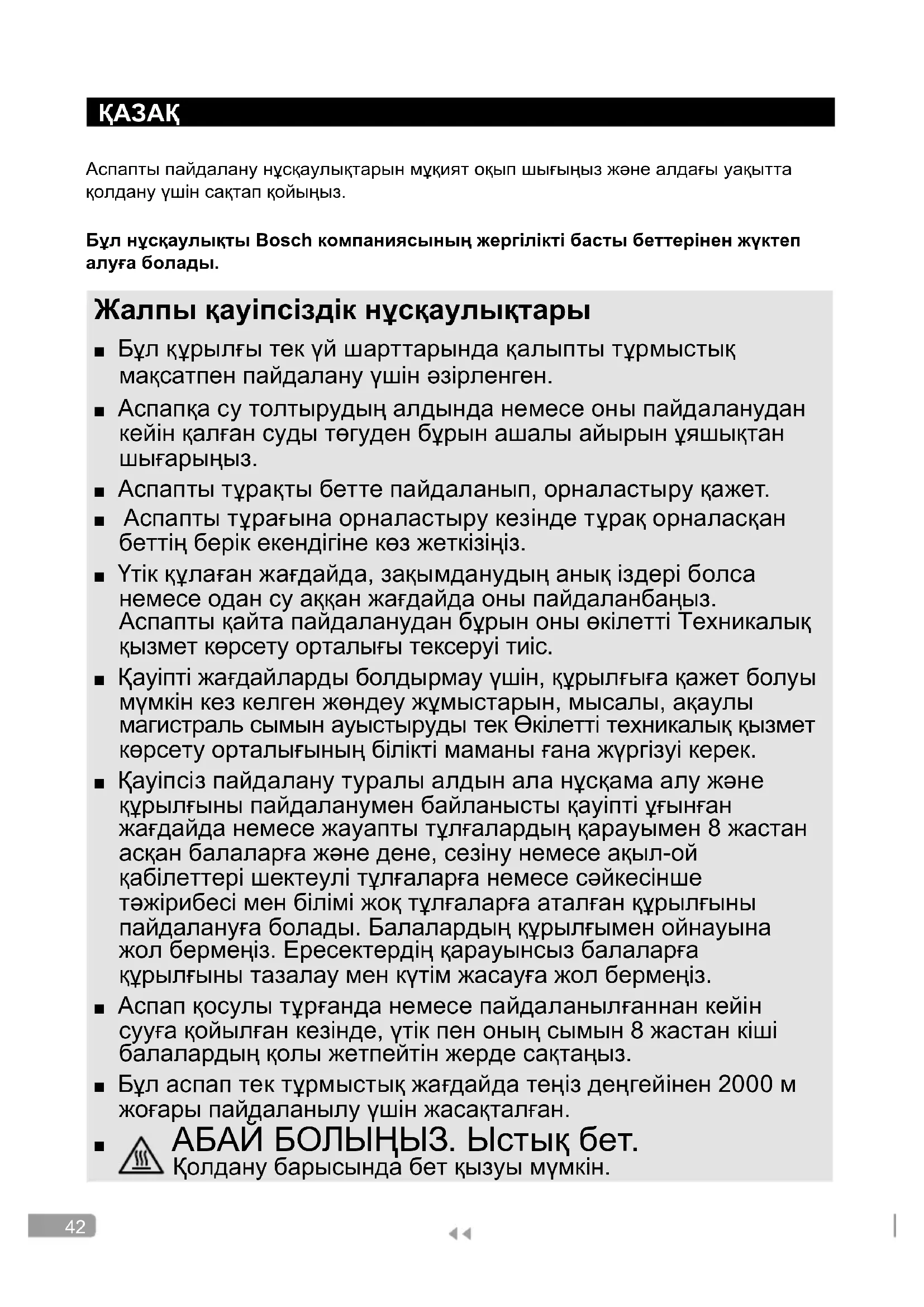 Аспапты пайдалану нұсқаулықтарын мұқият оқып шығыңыз және алдағы уақытта қолдану үшін сақтап қойыңыз. Бұл нұсқаулықты Bosch компаниясының жергілікті басты беттерінен жүктеп алуға болады. Жалпы қауіпсіздік нұсқаулықтары ■ Бұл құрылғы тек үй шарттарында қалыпты тұрмыстық мақсатпен пайдалану үшін әзірленген. ■ Аспапқа су толтырудың алдында немесе оны пайдаланудан кейін қалған суды төгуден бұрын ашалы айырын ұяшықтан