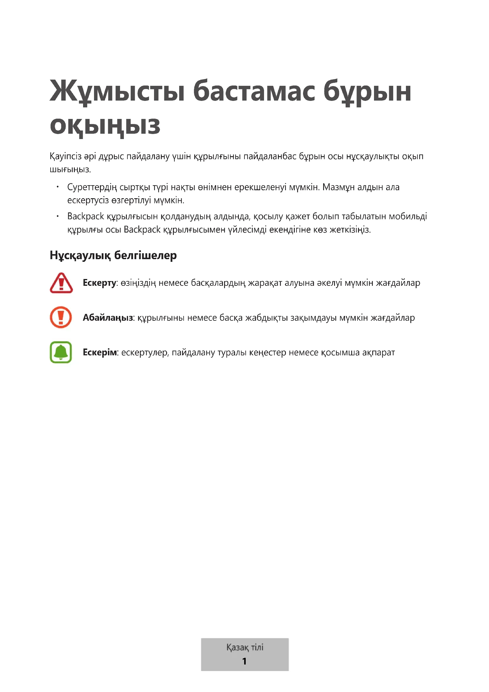 Backpack құрылғысын қолданудың алдында, қосылу қажет болып табылатын мобильді құрылғы осы Backpack құрылғысымен үйлесімді екендігіне көз жеткізіңіз. Нұсқаулық белгішелер Ескерту: өзіңіздің немесе басқалардың жарақат алуына әкелуі мүмкін жағдайлар Абайлаңыз: құрылғыны немесе басқа жабдықты зақымдауы мүмкін жағдайлар Ескерім: ескертулер, пайдалану туралы кеңестер немесе қосымша ақпарат