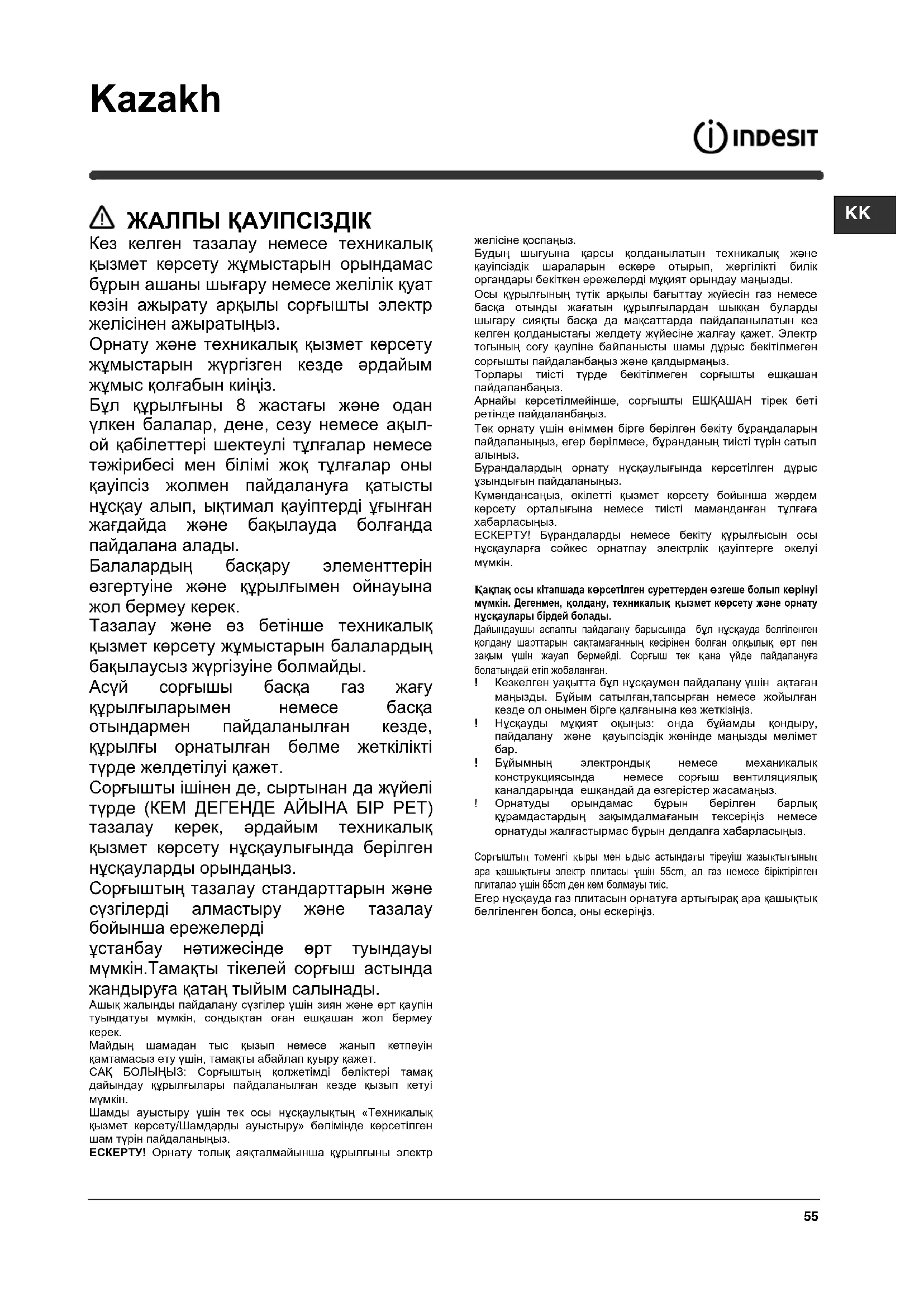 ЖАЛПЫ ҚАУІПСІЗДІК Кез келген тазалау немесе техникалық қызмет көрсету жұмыстарын орындамас бұрын ашаны шығару немесе желілік қуат көзін ажырату арқылы сорғышты электр желісінен ажыратыңыз. Орнату жəне техникалық қызмет көрсету жұмыстарын жүргізген кезде əрдайым жұмыс қолғабын киіңіз. Бұл құрылғыны 8 жастағы жəне одан үлкен балалар, дене, сезу немесе ақыл- ой қабілеттері шектеулі тұлғалар немесе тəжірибесі мен білімі жоқ тұлғалар оны қауіпсіз жолмен пайдалануға қатысты нұсқау алып, ықтимал қауіптерді ұғынған жағдайда жəне бақылауда болғанда пайдалана алады. Балалардың басқару элементтерін өзгертуіне жəне құрылғымен ойнауына жол бермеу керек. Тазалау жəне өз бетінше техникалық қызмет көрсету жұмыстарын балалардың бақылаусыз жүргізуіне болмайды. Асүй сорғышы басқа газ жағу құрылғыларымен немесе басқа отындармен пайдаланылған кезде, құрылғы орнатылған бөлме жеткілікті түрде желдетілуі қажет. Сорғышты ішінен де, сыртынан да жүйелі түрде (КЕМ ДЕГЕНДЕ АЙЫНА БІР РЕТ) тазалау керек, əрдайым техникалық қызмет көрсету нұсқаулығында берілген нұсқауларды орындаңыз. Сорғыштың тазалау стандарттарын жəне сүзгілерді алмастыру жəне тазалау бойынша ережелерді ұстанбау нəтижесінде өрт туындауы мүмкін.Тамақты тікелей сорғыш астында жандыруға қатаң тыйым салынады. Ашық жалынды пайдалану сүзгілер үшін зиян жəне өрт қаупін туындатуы мүмкін, сондықтан оған ешқашан жол бермеу
