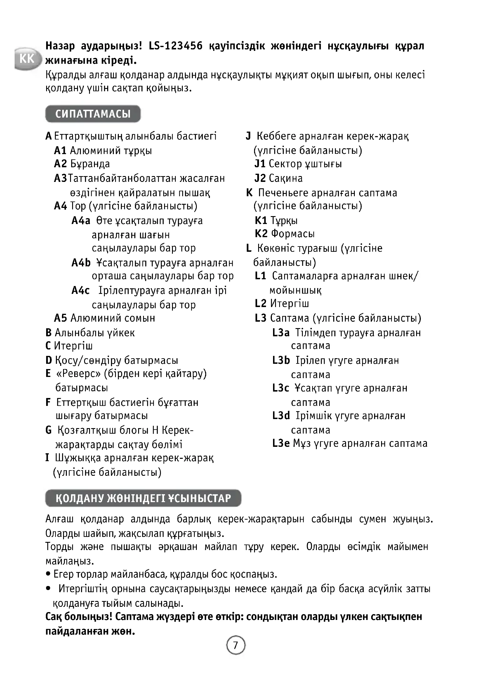 НАСАДКА ДЛЯ КЕББЕ (див. рис. 4.1 і 4.3) Практична порада: Щоб отримати тонку масу для кеббе або кефти, пропустіть м’ясо 2–3 рази через м’ясорубку для досягнення бажаної консистенції. Насадка для печива (див. рис. 5.1–5.3) Приготуйте тісто. Ви отримаєте кращі результати, якщо тісто буде трохи м’яким. Виберіть малюнок, зіставивши стрілку з вибраною формою. Використовуйте, поки не отримаєте потрібну кількість печива. UK6 ОВОЧЕРІЗКА (див. рис. 6.1–6.3) Поради для отримання кращих результатів: Бажано використовувати щільні інгредієнти, щоб отримати очікуваний результат і уникнути накопичення інгредієнтів у корпусі барабана. Не використовуйте прилад для натирання або подрібнення надто твердих продуктів, зокрема цукру чи великих шматків м’яса. ЧИЩЕННЯ (див. рис. 7.1–7.4) ПІДСТАВКА ДЛЯ ЗБЕРІГАННЯ (див. рис. 8.1–8.2) UK7 Назар аударыңыз! LS-123456 қауіпсіздік жөніндегі нұсқаулығы құрал жинағына кіреді. Құралды алғаш қолданар алдында нұсқаулықты мұқият оқып шығып, оны келесі қолдану үшін сақтап қойыңыз. СИПАТТАМАСЫ A Еттартқыштың алынбалы бастиегі A1 Алюминий тұрқы A2 Бұранда A3 Таттанбайтан болаттан жасалған өздігінен қайралатын пышақ A4 Тор (үлгісіне байланысты) A4a Өте ұсақталып турауға арналған шағын саңылаулары бар тор A4b Ұсақталып турауға арналған орташа саңылаулары бар тор A4c Ірілеп турауға арналған ірі саңылаулары бар тор A5 Алюминий сомын B Алынбалы үйкек C Итергіш D Қосу/сөндіру батырмасы E «Реверс» (бірден кері қайтару)