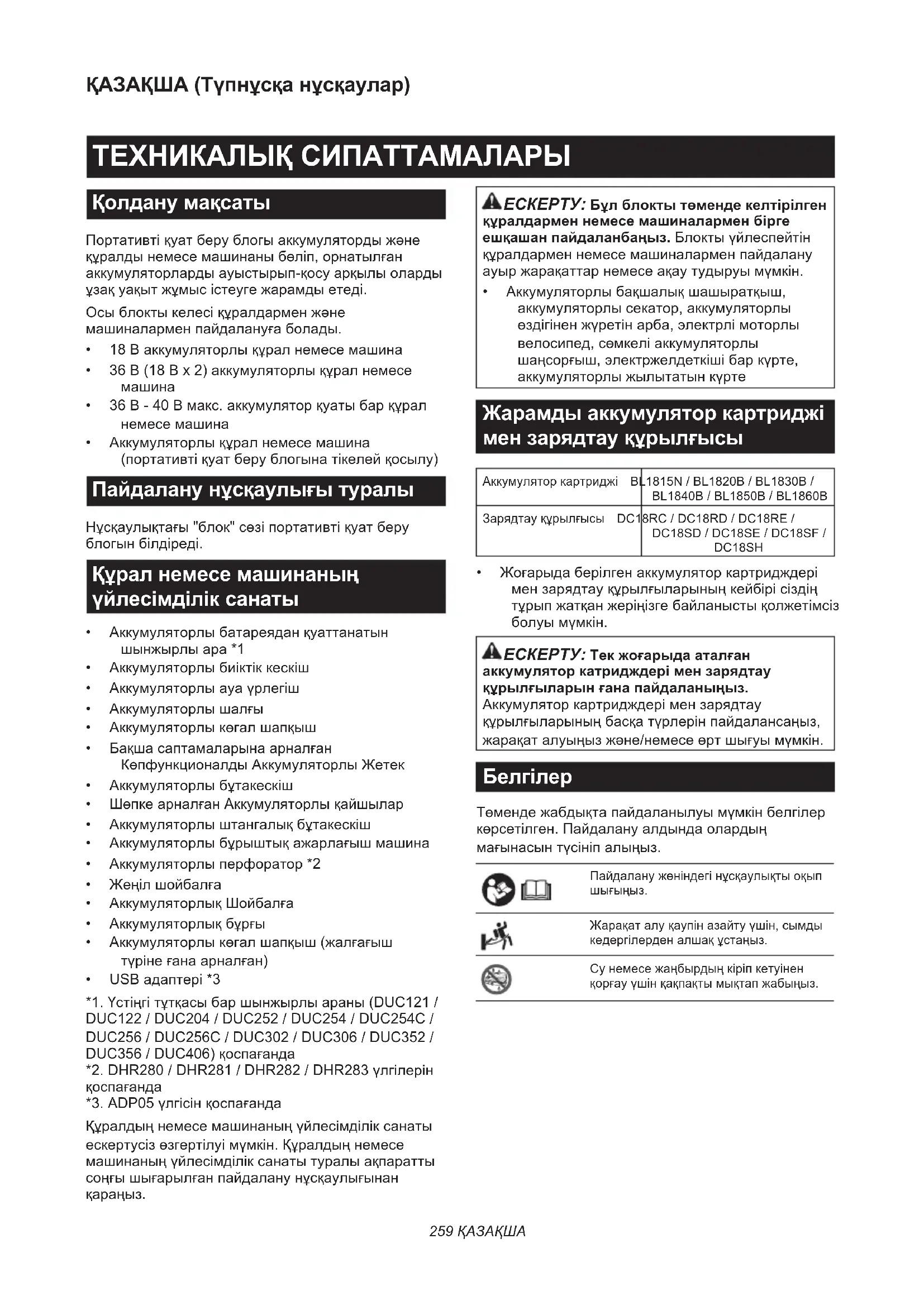 - Адаптер,рассчитанныйнапредельноенапря- жение36–40В ПРИМЕЧАНИЕ:Некоторыеэлементысписка могутвходитьвкомплектинструментавкачестве стандартныхприспособлений.Онимогутотли- чатьсявзависимостиотстраны.259 ҚАЗАҚША ҚАЗАҚША (Түпнұсқа нұсқаулар) ТЕХНИКАЛЫҚ СИПАТТАМАЛАРЫ Қолдану мақсаты Портативтіқуатберублогыаккумулятордыжәне құралдынемесемашинаныбөліп,орнатылған аккумуляторлардыауыстырып-қосуарқылыоларды ұзақуақытжұмысістеугежарамдыетеді. Осыблоктыкелесіқұралдарменжәне машиналарменпайдалануғаболады.