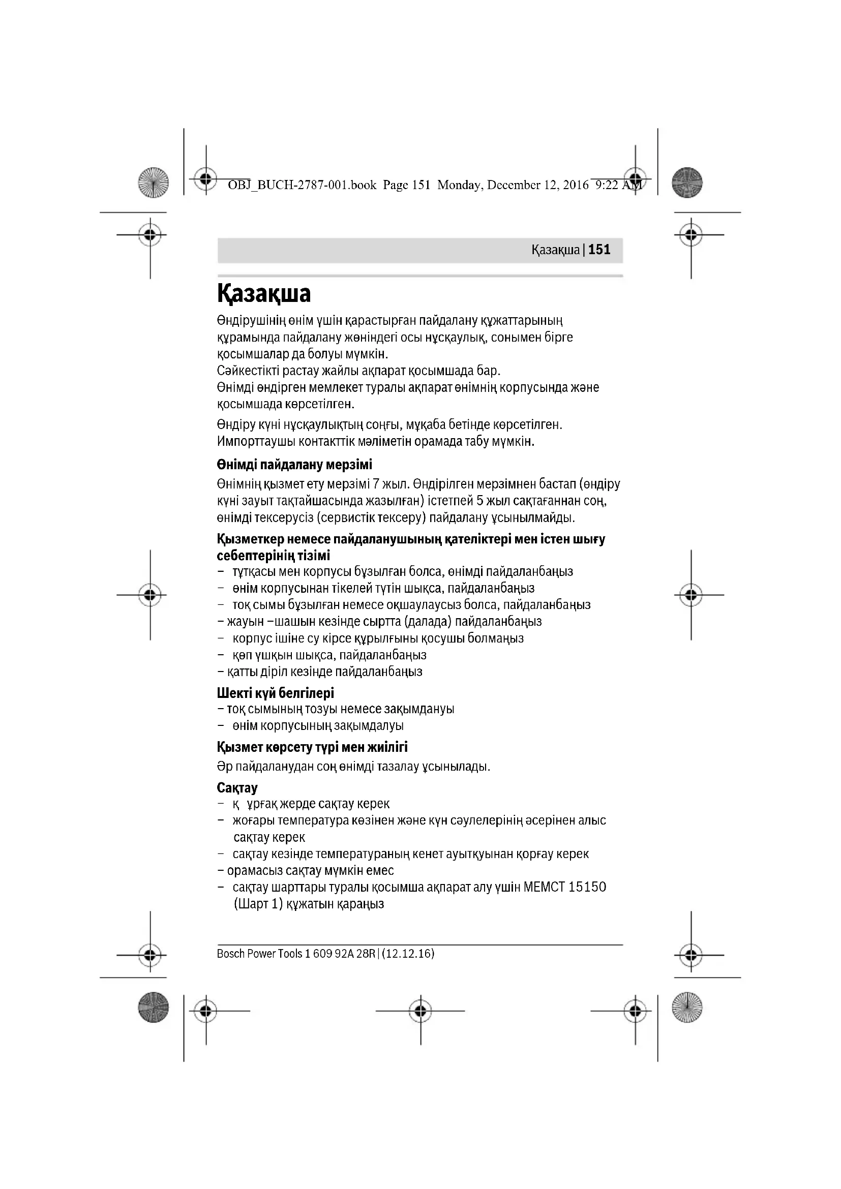 –құрғақ жерде сақтау керек –жоғары температура көзінен және күн сәулелерінің әсерінен алыс сақтау керек – сақтау кезінде температураның кенет ауытқуынан қорғау керек – орамасыз сақтау мүмкін емес – сақтау шарттары туралы қосымша ақпарат алу үшін МЕМСТ 15150 (Шарт 1) құжатын қараңыз OBJ_BUCH-2787-001.book Page 151 Monday, December 12, 2016 9:22 AM1 609 92A 28R | (12.12.16) Bosch Power Tools 152 | Қaзақша