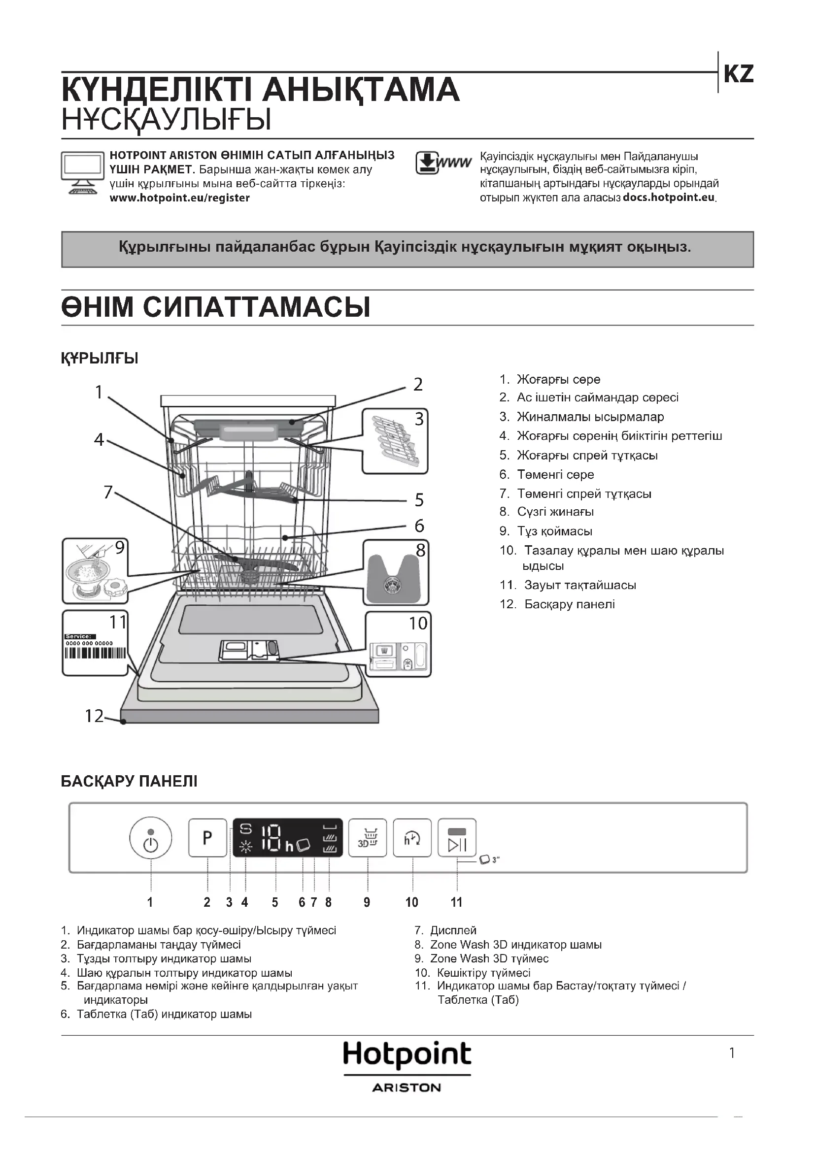 БАСҚАРУ ПАНЕЛІ1. Индикатор шамы бар қосу-өшіру/Ысыру түймесі2. Бағдарламаны таңдау түймесі3. Тұзды толтыру индикатор шамы4. Шаю құралын толтыру индикатор шамы5. Бағдарлама нөмірі және кейінге қалдырылған уақыт индикаторы6. Таблетка (Таб) индикатор шамы7. Дисплей8. Zone Wash 3D индикатор шамы9. Zone Wash 3D түймес10. Кешіктіру түймесі11. Индикатор шамы бар Бастау/тоқтату түймесі / Таблетка (Таб)HOTPOINT ARISTON ӨНІМІН САТЫП АЛҒАНЫҢЫЗ ҮШІН РАҚМЕТ. Барынша жан-жақты көмек алу үшін құрылғыны мына веб-сайтта тіркеңіз: www.hotpoint.eu/register Қауіпсіздік нұсқаулығы мен Пайдаланушы нұсқаулығын, біздің веб-сайтымызға кіріп, кітапшаның артындағы нұсқауларды орындай отырып жүктеп ала аласыз docs.hotpoint.eu Құрылғыны пайдаланбас бұрын Қауіпсіздік нұсқаулығын мұқият оқыңыз. ӨНІМ СИПАТТАМАСЫ ҚҰРЫЛҒЫ1. Жоғарғы сөре2. Ас ішетін саймандар сөресі3. Жиналмалы ысырмалар4. Жоғарғы сөренің биіктігін реттегіш5. Жоғарғы спрей тұтқасы6. Төменгі сөре7. Төменгі спрей тұтқасы8. Сүзгі жинағы9. Тұз қоймасы10. Тазалау құралы мен шаю құралы ыдысы11. Зауыт тақтайшасы12. Басқару панелі0000 000 00000 Service: