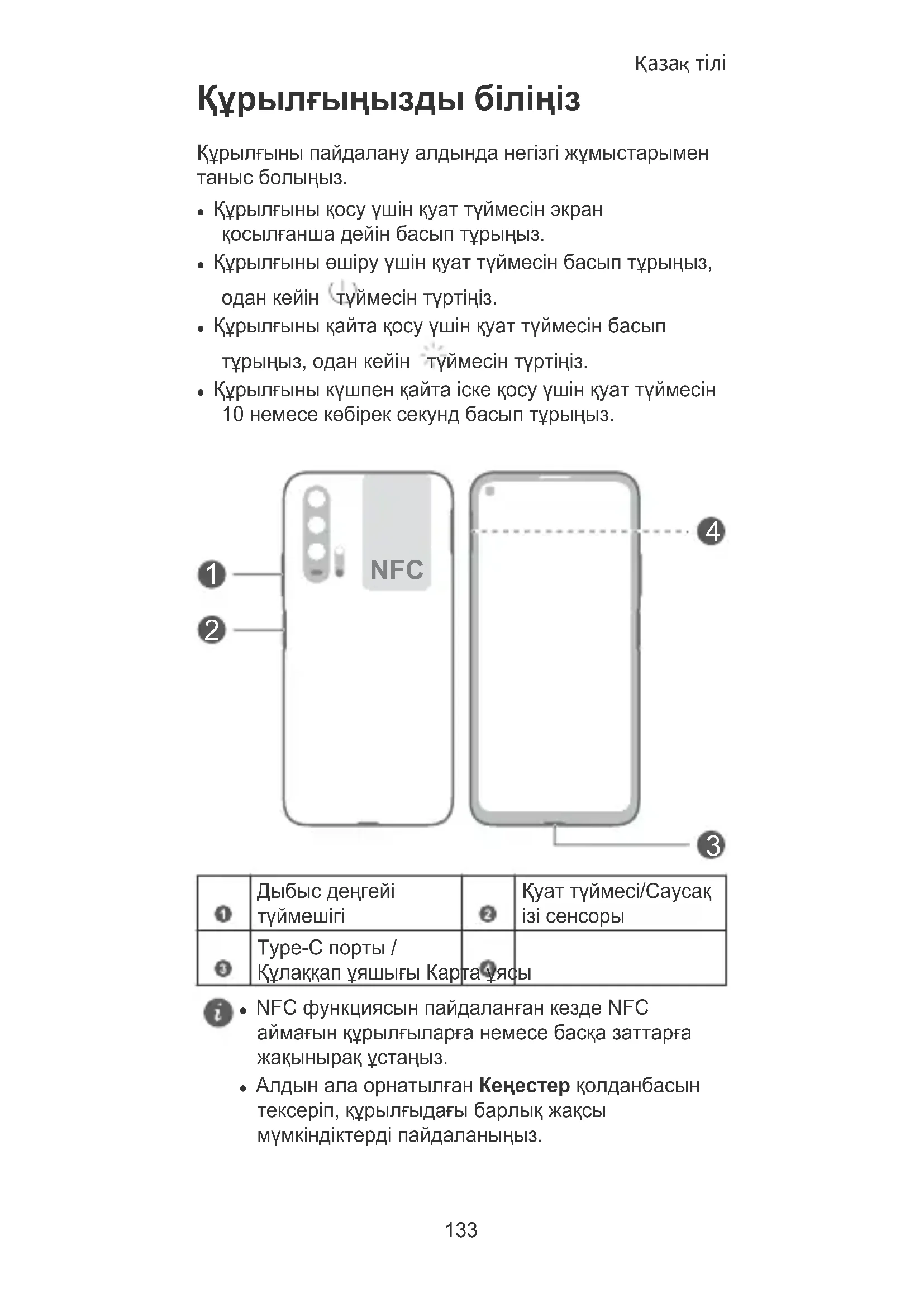 ɂɇɎɈɊɆȺɐɂɈɇɇɕɏ ɐȿɅəɏ ȻȿɁ ɄȺɄɂɏ-ɅɂȻɈ əȼɇɕɏ ɂɅɂ ɇȿəȼɇɕɏȽȺɊȺɇɌɂɃ.Құрылғыңызды біліңіз Құрылғыны пайдалану алдында негізгі жұмыстарымен таныс болыңыз. l Құрылғыны қосу үшін қуат түймесін экран қосылғанша дейін басып тұрыңыз. l Құрылғыны өшіру үшін қуат түймесін басып тұрыңыз, одан кейін түймесін түртіңіз. l Құрылғыны қайта қосу үшін қуат түймесін басып тұрыңыз, одан кейін түймесін түртіңіз. l Құрылғыны күшпен қайта іске қосу үшін қуат түймесін 10 немесе көбірек секунд басып тұрыңыз. NFC