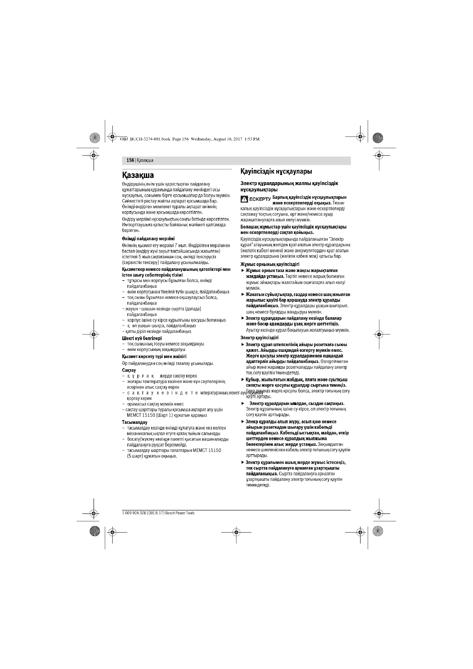 ғуы мүмкін. Оған тимеңіз. Кездейсоқ тигенде, сол жерді сумен шайыңыз. Сұйықтық көзге тисе, медициналық көмек алыңыз. Аккумулятордағы сұйықтық теріні тітіркендіруі немесе күйдіруі мүмкін. OBJ_BUCH-3274-001.book Page 157 Wednesday, August 16, 2017 1:53 PM158 | Қaзақша 1 609 92A 3ZU | (16.8.17) Bosch Power Tools