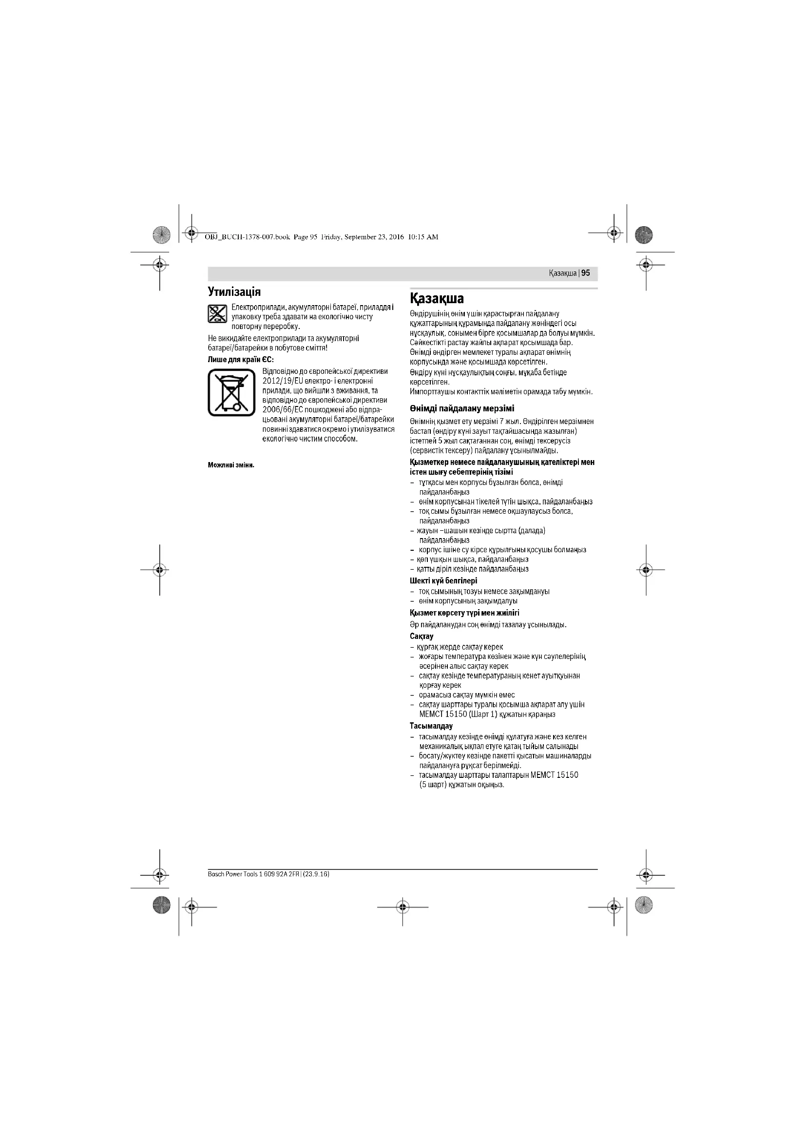 Електроприлади, акумуляторні батареї, приладдя і упаковку треба здавати на екологічно чисту повторну переробку. Не викидайте електроприлади та акумуляторні батареї/батарейки в побутове сміття! Лише для країн ЄС: Відповідно до європейської директиви 2012/19/EU електро- і електронні прилади, що вийшли з вживання, та відповідно до європейської директиви 2006/66/EC пошкоджені або відпра- цьовані акумуляторні батареї/батарейки повинні здаватися окремо і утилізуватися екологічно чистим способом. Можливі зміни. Қaзақша Өндірушінің өнім үшін қарастырған пайдалану құжаттарының құрамында пайдалану жөніндегі осы нұсқаулық, сонымен бірге қосымшалар да болуы мүмкін. Сәйкестікті растау жайлы ақпарат қосымшада бар. Өнімді өндірген мемлекет туралы ақпарат өнімнің корпусында және қосымшада көрсетілген. Өндіру күні нұсқаулықтың соңғы, мұқаба бетінде көрсетілген. Импорттаушы контакттік мәліметін орамада табу мүмкін. Өнімді пайдалану мерзімі Өнімнің қызмет ету мерзімі 7 жыл. Өндірілген мерзімнен бастап (өндіру күні зауыт тақтайшасында жазылған) істетпей 5 жыл сақтағаннан соң, өнімді тексерусіз (сервистік тексеру) пайдалану ұсынылмайды. Қызметкер немесе пайдаланушының қателіктері мен істен шығу себептерінің тізімі – тұтқасы мен корпусы бұзылған болса, өнімді пайдаланбаңыз – өнім корпусынан тікелей түтін шықса, пайдаланбаңыз – тоқ сымы бұзылған немесе оқшаулаусыз болса, пайдаланбаңыз – жауын –шашын кезінде сыртта (далада) пайдаланбаңыз – корпус ішіне су кірсе құрылғыны қосушы болмаңыз – қөп үшқын шықса, пайдаланбаңыз – қатты діріл кезінде пайдаланбаңыз Шекті күй белгілері – тоқ сымының тозуы немесе зақымдануы – өнім корпусының зақымдалуы Қызмет көрсету түрі мен жиілігі Әр пайдаланудан соң өнімді тазалау ұсынылады.
