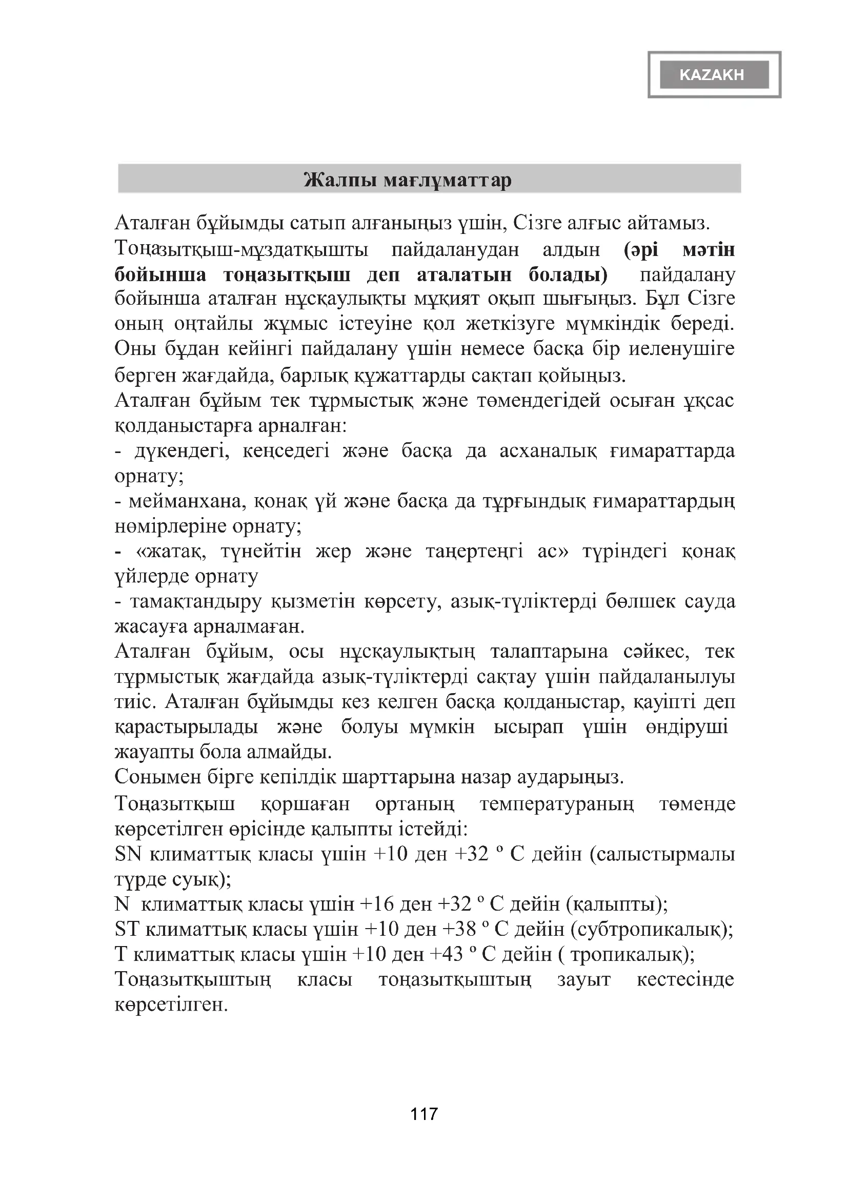 - мейманхана, қонақ үй жəне басқа да тұрғындық ғимараттардың нөмірлеріне орнату; - «жатақ, түнейтін жер жəне таңертеңгі ас» түріндегі қонақ үйлерде орнату - тамақтандыру қызметін көрсету, азық-түліктерді бөлшек сауда жасауға арналмаған. Аталған бұйым, осы нұсқаулықтың талаптарына сəйкес, тек тұрмыстық жағдайда азық-түліктерді сақтау үшін пайдаланылуы тиіс. Аталған бұйымды кез келген басқа қолданыстар, қауіпті деп қарастырылады жəне болуы мүмкін ысырап үшін өндіруші жауапты бола алмайды. Сонымен бірге кепілдік шарттарына назар аударыңыз. Тоңазытқыш қоршаған ортаның температураның төменде көрсетілген өрісінде қалыпты істейді: SN климаттық класы үшін +10 ден +32 º С дейін (салыстырмалы түрде суық); N климаттық класы үшін +16 ден +32 º С дейін (қалыпты); SТ климаттық класы үшін +10 ден +38 º С дейін (субтропикалық); Т климаттық класы үшін +10 ден +43 º С дейін ( тропикалық); Тоңазытқыштың класы тоңазытқыштың зауыт кестесінде көрсетілген. 117Басқа жағдайларда пайдаланған кезде тоңазытқыштың энергетикалық сипаттамалары өндірушінің көрсетілген нұсқауларына сəйкес келмеуі мүмкін. Тоңазытқышты жатын бөлмелерде пайдалануға болмайды. Тоңазытқыш жұмыс істеп тұрған кезде, атқарымдық шулар мен дыбыстардың болатынын ескеру қажет. НАЗАР АУДАРЫҢЫЗ! Оны сақтау немесе дүлей күш əрекеттердің (өрт, дүлей апаттар) кесірінен болған, оны пайдалану шарттарын бұзудың салдарынан пайда болған, бұйымның бүлінуі жəне ақау үшін (соның ішінде, кепілдік кезеңінде) өндіруші жауапты емес. Тасымалдау кезінде тоңазытқыштың бүлінген жерлерінің болмауын тексеріңіз. Оларды тапқан кезде жақын маңдағы Өкілетті Қызмет көрсету Орталығына телефон шалыңыз. ҚАУІПСІЗДІК ТЕХНИКАСЫ БОЙЫНША ТАЛАПТАР