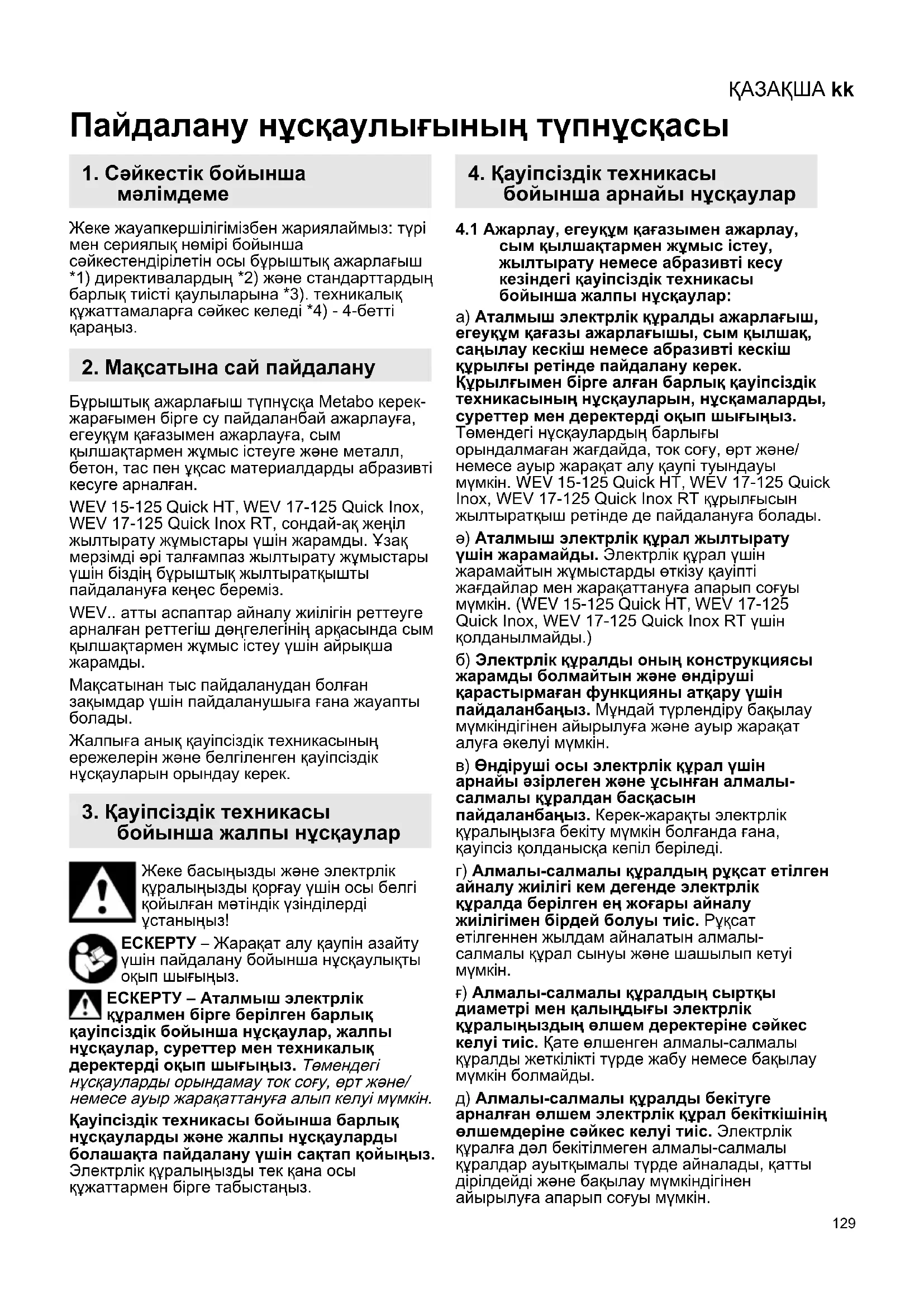 сым қылшақтармен жұмыс істеу, жылтырату немесе абразивті кесу кезіндегі қауіпсіздік техникасы бойынша жалпы нұсқаулар: а) Аталмыш электрлік құралды ажарлағыш, егеуқұм қағазы ажарлағышы, сым қылшақ, саңылау кескіш немесе абразивті кескіш құрылғы ретінде пайдалану керек. Құрылғымен бірге алған барлық қауіпсіздік техникасының нұсқауларын, нұсқамаларды, суреттер мен деректерді оқып шығыңыз. Төмендегі нұсқаулардың барлығы орындалмаған жағдайда, ток соғу, өрт және/ немесе ауыр жарақат алу қаупі туындауы мүмкін. WEV 15-125 Quick HT, WEV 17-125 Quick Inox, WEV 17-125 Quick Inox RT құрылғысын жылтыратқыш ретінде де пайдалануға болады. ә) Аталмыш электрлік құрал жылтырату үшін жарамайды. Электрлік құрал үшін жарамайтын жұмыстарды өткізу қауіпті жағдайлар мен жарақаттануға апарып соғуы мүмкін. (WEV 15-125 Quick HT, WEV 17-125 Quick Inox, WEV 17-125 Quick Inox RT үшін қолданылмайды.) б) Электрлік құралды оның конструкциясы жарамды болмайтын және өндіруші қарастырмаған функцияны атқару үшін пайдаланбаңыз. Мұндай түрлендіру бақылау мүмкіндігінен айырылуға және ауыр жарақат алуға әкелуі мүмкін. в) Өндіруші осы электрлік құрал үшін арнайы әзірлеген және ұсынған алмалы- салмалы құралдан басқасын пайдаланбаңыз. Керек-жарақты электрлік құралыңызға бекіту мүмкін болғанда ғана, қауіпсіз қолданысқа кепіл беріледі. г) Алмалы-салмалы құралдың рұқсат етілген айналу жиілігі кем дегенде электрлік құралда берілген ең жоғары айналу жиілігімен бірдей болуы тиіс. Рұқсат етілгеннен жылдам айналатын алмалы- салмалы құрал сынуы және шашылып кетуі