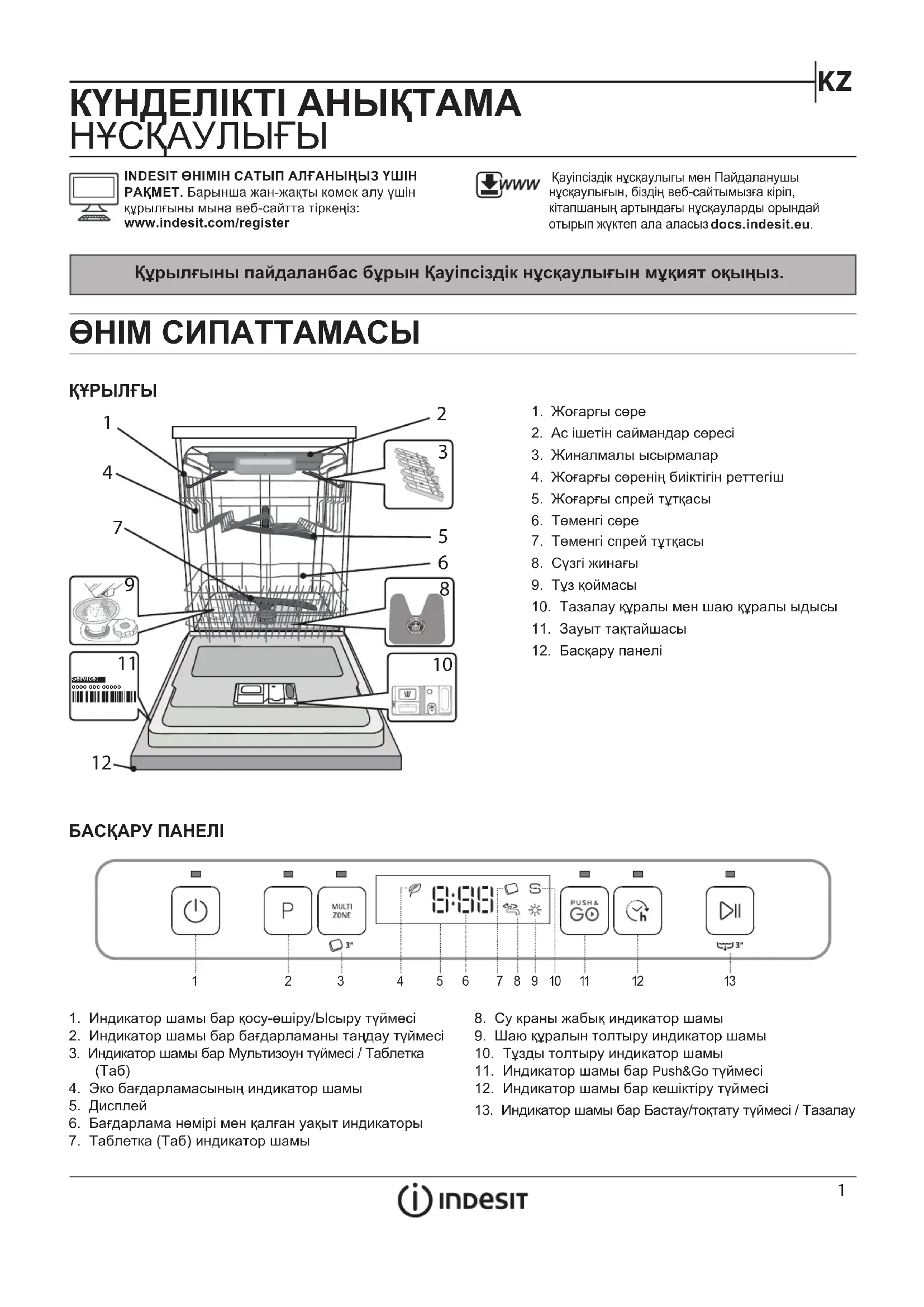 БАСҚАРУ ПАНЕЛІ8. Су краны жабық индикатор шамы9. Шаю құралын толтыру индикатор шамы10. Тұзды толтыру индикатор шамы11. Индикатор шамы бар Push&Go түймесі 12. Индикатор шамы бар кешіктіру түймесі13. Индикатор шамы бар Бастау/тоқтату түймесі / ТазалауҚұрылғыны пайдаланбас бұрын Қауіпсіздік нұсқаулығын мұқият оқыңыз. ӨНІМ СИПАТТАМАСЫ ҚҰРЫЛҒЫINDESIT ӨНІМІН САТЫП АЛҒАНЫҢЫЗ ҮШІН РАҚМЕТ. Барынша жан-жақты көмек алу үшін құрылғыны мына веб-сайтта тіркеңіз: www.indesit.com/register Қауіпсіздік нұсқаулығы мен Пайдаланушы нұсқаулығын, біздің веб-сайтымызға кіріп, кітапшаның артындағы нұсқауларды орындай отырып жүктеп ала аласыз docs.indesit.eu