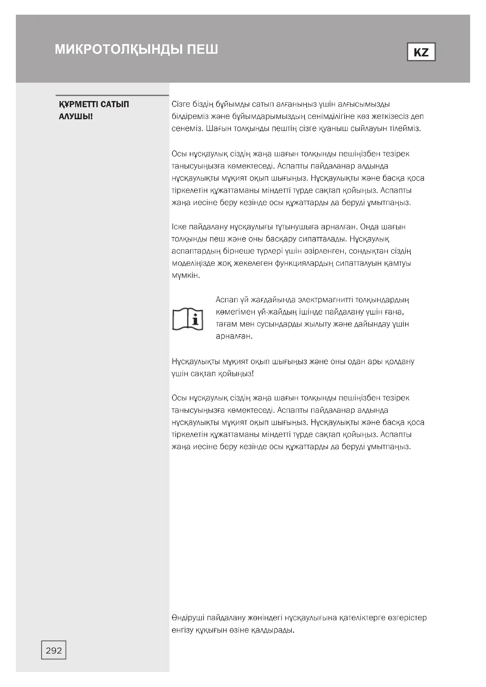 Нұсқаулықты мұқият оқып шығыңыз және оны одан ары қолдану үшін сақтап қойыңыз! Осы нұсқаулық сіздің жаңа шағын толқынды пешіңізбен тезірек танысуыңызға көмектеседі. Аспапты пайдаланар алдында нұсқаулықты мұқият оқып шығыңыз. Нұсқаулықты және басқа қоса тіркелетін құжаттаманы міндетті түрде сақтап қойыңыз. Аспапты жаңа иесіне беру кезінде осы құжаттарды да беруді ұмытпаңыз. Өндіруші пайдалану жөніндегі нұсқаулығына қателіктерге өзгерістер енгізу құқығын өзіне қалдырады. ҚҰРМЕТТІ САТЫП
