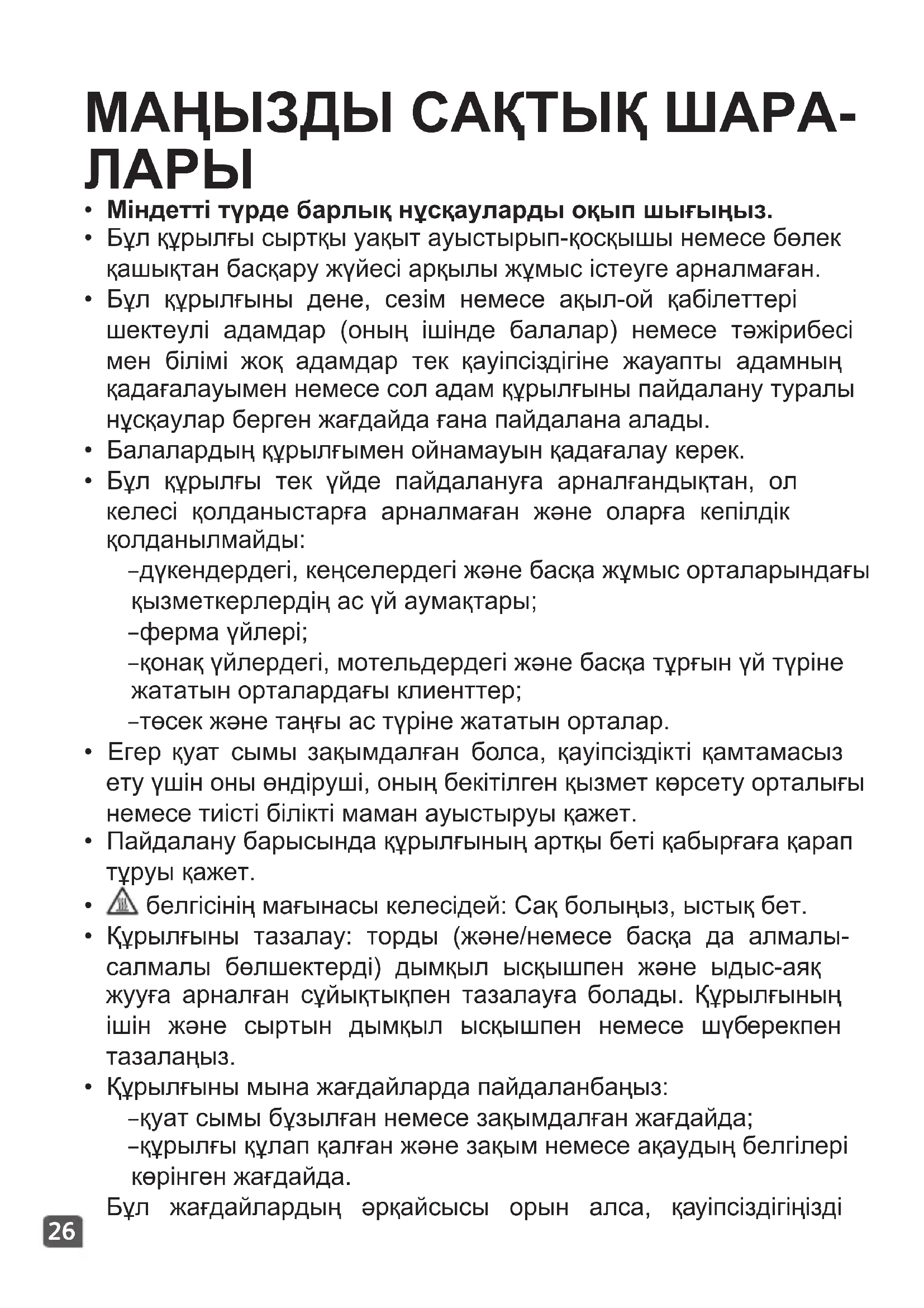 - Құрылғыны мына жағдайларда пайдаланбаңыз: – қуат сымы бұзылған немесе зақымдалған жағдайда; – құрылғы құлап қалған және зақым немесе ақаудың белгілері көрінген жағдайда. Бұл жағдайлардың әрқайсысы орын алса, қауіпсіздігіңізді27