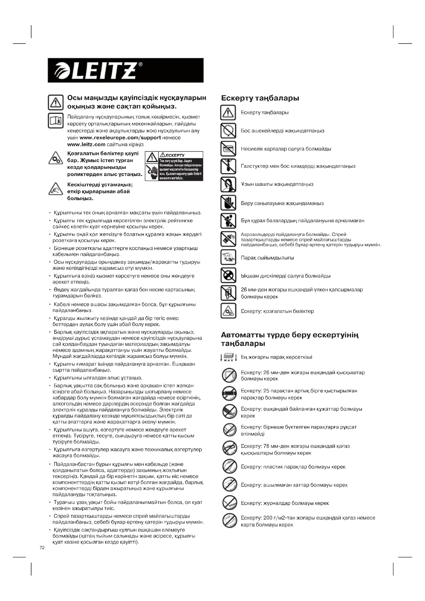 - Қауіпсіздік сақтандырғыш құлпын ешқашан елемеуге болмайды (қатаң тыйым салынады және әсіресе, құрылғы қуат көзіне қосылған кезде қауіпті). Осы маңызды қауіпсіздік нұсқауларын оқыңыз және сақтап қойыңыз. Пайдалану нұсқауларының толық көшірмесін, қызмет көрсету орталықтарының мекенжайларын, пайдалы кеңестерді және ақаулықтарды жою нұсқаулығын алу үшін www.rexeleurope.com/support немесе www.leitz.com сайтына кіріңіз Бос әшекейлерді жақындатпаңыз Ескерту таңбалары Ескерту таңбалары Кескіштерді ұстамаңыз; өткір қырларынан абай