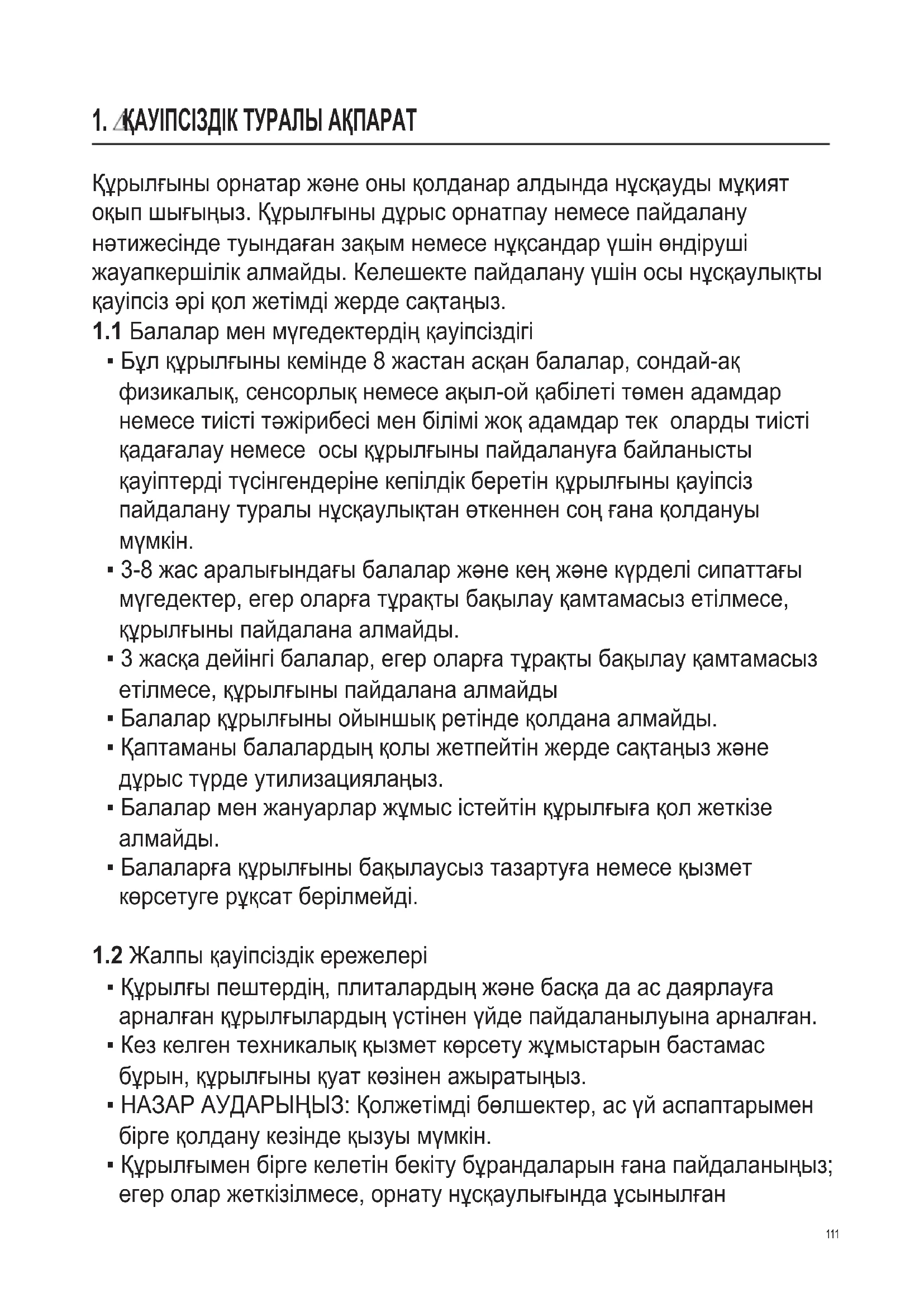 - Бұл құрылғыны кемінде 8 жастан асқан балалар, сондай-ақ физикалық, сенсорлық немесе ақыл-ой қабілеті төмен адамдар немесе тиісті тəжірибесі мен білімі жоқ адамдар тек оларды тиісті қадағалау немесе осы құрылғыны пайдалануға байланысты қауіптерді түсінгендеріне кепілдік беретін құрылғыны қауіпсіз пайдалану туралы нұсқаулықтан өткеннен соң ғана қолдануы