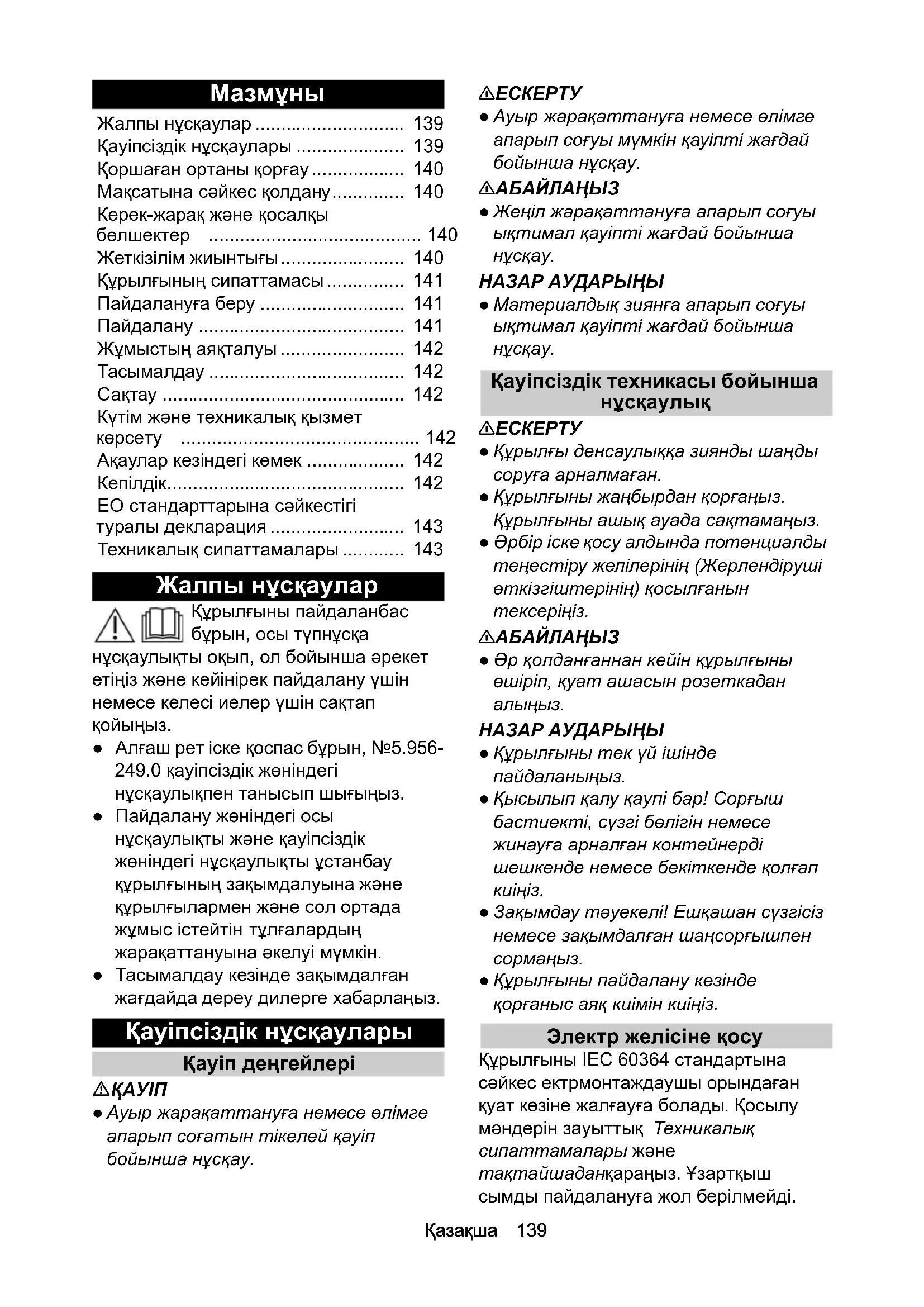 - Қауіпсіздік нұсқаулары p. 139