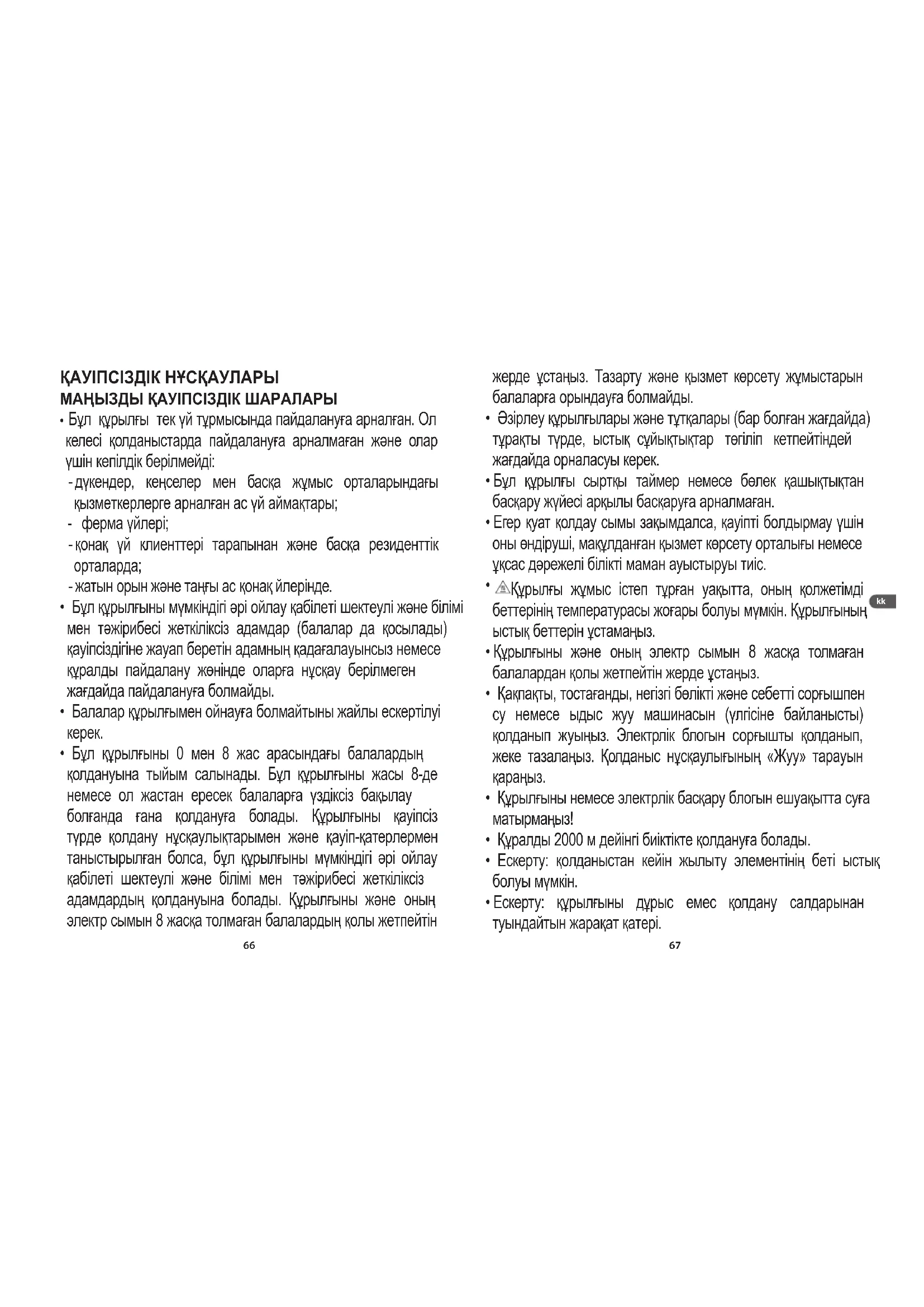 - Бұл құрылғыны 0 мен 8 жас арасындағы балалардың қолдануына тыйым салынады. Бұл құрылғыны жасы 8-де немесе ол жастан ересек балаларға үздіксіз бақылау болғанда ғана қолдануға болады. Құрылғыны қауіпсіз түрде қолдану нұсқаулықтарымен және қауіп-қатерлермен таныстырылған болса, бұл құрылғыны мүмкіндігі әрі ойлау қабілеті шектеулі және білімі мен тәжірибесі жеткіліксіз адамдардың қолдануына болады. Құрылғыны және оның электр сымын 8 жасқа толмаған балалардың қолы жетпейтін жерде ұстаңыз. Тазарту және қызмет көрсету жұмыстарын балаларға орындауға болмайды.