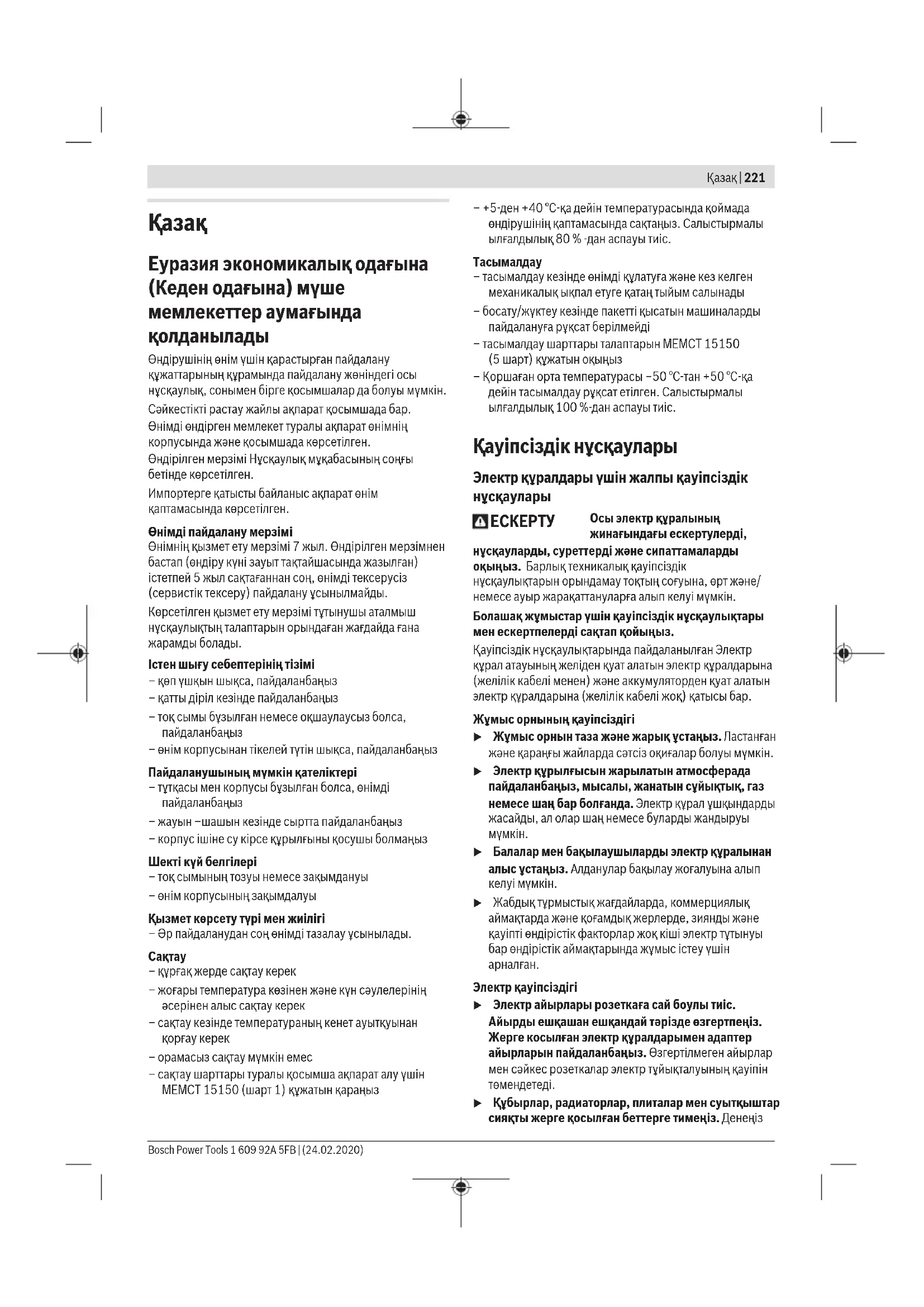 Электр қауіпсіздігі u Электр айырлары розеткаға сай боулы тиіс. Айырды ешқашан ешқандай тәрізде өзгертпеңіз. Жерге косылған электр құралдарымен адаптер айырларын пайдаланбаңыз. Өзгертілмеген айырлар мен сәйкес розеткалар электр тұйықталуының қауіпін төмендетеді. u Құбырлар, радиаторлар, плиталар мен суытқыштар сияқты жерге қосылған беттерге тимеңіз. Денеңіз Bosch Power Tools 1 609 92A 5FB | (24.02.2020)222 | Қазақ жерге қосылған болса жоғары тоқ соғу қауіпі пайда