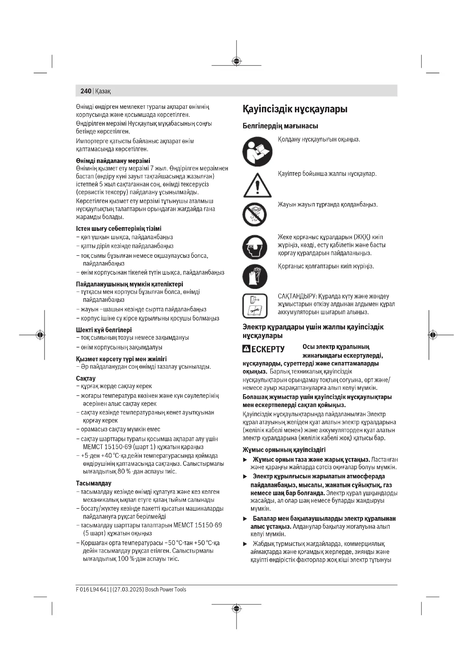 Еуразия экономикалық одағына (Кеден одағына) мүше мемлекеттер аумағында қолданылады Өндірушінің өнім үшін қарастырған пайдалану құжаттарының құрамында пайдалану жөніндегі осы нұсқаулық, сонымен бірге қосымшалар да болуы мүмкін. Сəйкестікті растау жайлы ақпарат қосымшада бар. Bosch Power Tools F 016 L94 641 | (27.03.2025)240 | Қазақ Өнімді өндірген мемлекет туралы ақпарат өнімнің корпусында жəне қосымшада көрсетілген. Өндірілген мерзімі Нұсқаулық мұқабасының соңғы бетінде көрсетілген. Импортерге қатысты байланыс ақпарат өнім қаптамасында көрсетілген. Өнімді пайдалану мерзімі Өнімнің қызмет ету мерзімі 7жыл. Өндірілген мерзімнен бастап (өндіру күні зауыт тақтайшасында жазылған) істетпей 5жыл сақтағаннан соң, өнімді тексерусіз (сервистік тексеру) пайдалану ұсынылмайды. Көрсетілген қызмет ету мерзімі тұтынушы аталмыш нұсқаулықтың талаптарын орындаған жағдайда ғана жарамды болады. Iстен шығу себептерінің тізімі – қөп үшқын шықса, пайдаланбаңыз – қатты діріл кезінде пайдаланбаңыз – тоқ сымы бұзылған немесе оқшаулаусыз болса, пайдаланбаңыз – өнім корпусынан тікелей түтін шықса, пайдаланбаңыз Пайдаланушының мүмкін қателіктері – тұтқасы мен корпусы бұзылған болса, өнімді пайдаланбаңыз – жауын –шашын кезінде сыртта пайдаланбаңыз – корпус ішіне су кірсе құрылғыны қосушы болмаңыз Шекті күй белгілері – тоқ сымының тозуы немесе зақымдануы – өнім корпусының зақымдалуы Қызмет көрсету түрі мен жиілігі – Әр пайдаланудан соң өнімді тазалау ұсынылады.