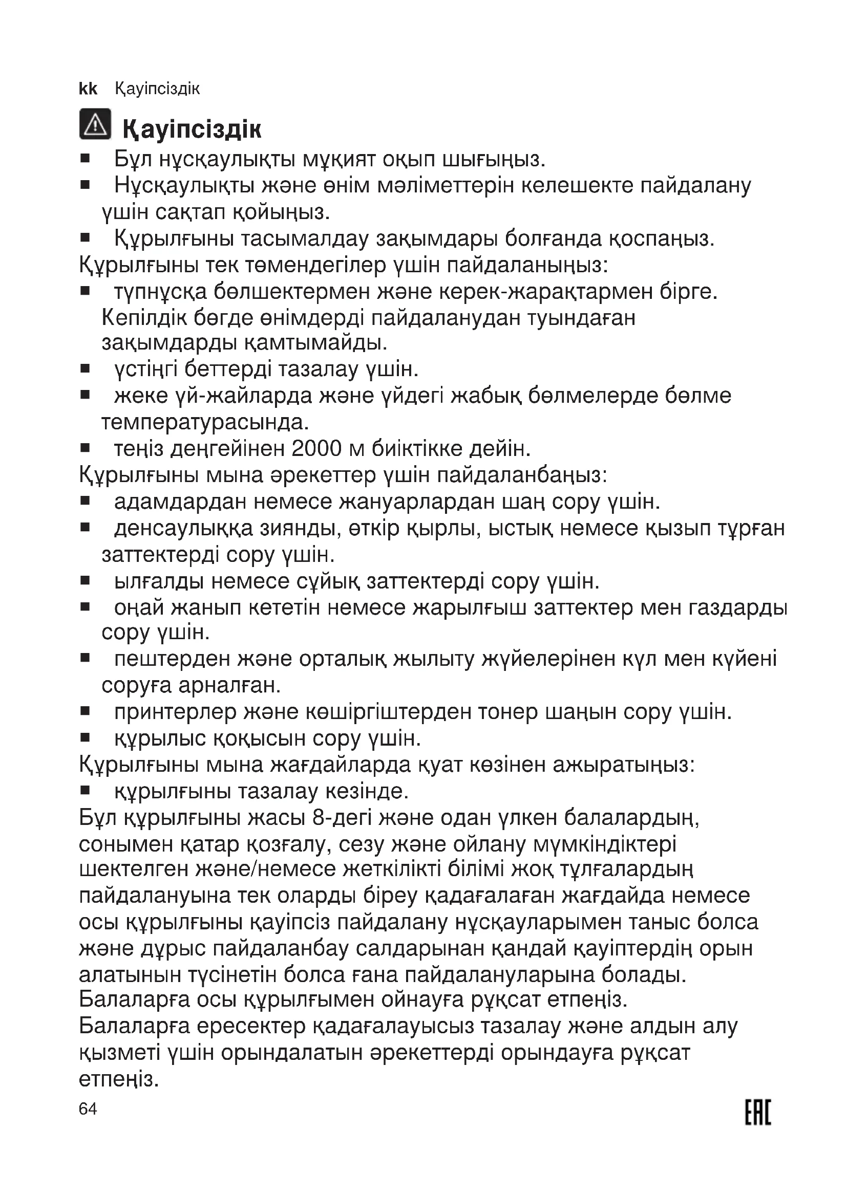 ¡ пештерден және орталық жылыту жүйелерінен күл мен күйені соруға арналған. ¡ принтерлер және көшіргіштерден тонер шаңын сору үшін. ¡ құрылыс қоқысын сору үшін. Құрылғыны мына жағдайларда қуат көзінен ажыратыңыз: ¡ құрылғыны тазалау кезінде. Бұл құрылғыны жасы 8-дегі және одан үлкен балалардың, сонымен қатар қозғалу, сезу және ойлану мүмкіндіктері шектелген және/немесе жеткілікті білімі жоқ тұлғалардың пайдалануына тек оларды біреу қадағалаған жағдайда немесе осы құрылғыны қауіпсіз пайдалану нұсқауларымен таныс болса және дұрыс пайдаланбау салдарынан қандай қауіптердің орын алатынын түсінетін болса ғана пайдалануларына болады. Балаларға осы құрылғымен ойнауға рұқсат етпеңіз. Балаларға ересектер қадағалауысыз тазалау және алдын алу қызметі үшін орындалатын әрекеттерді орындауға рұқсат етпеңіз.Қауіпсіздік kk