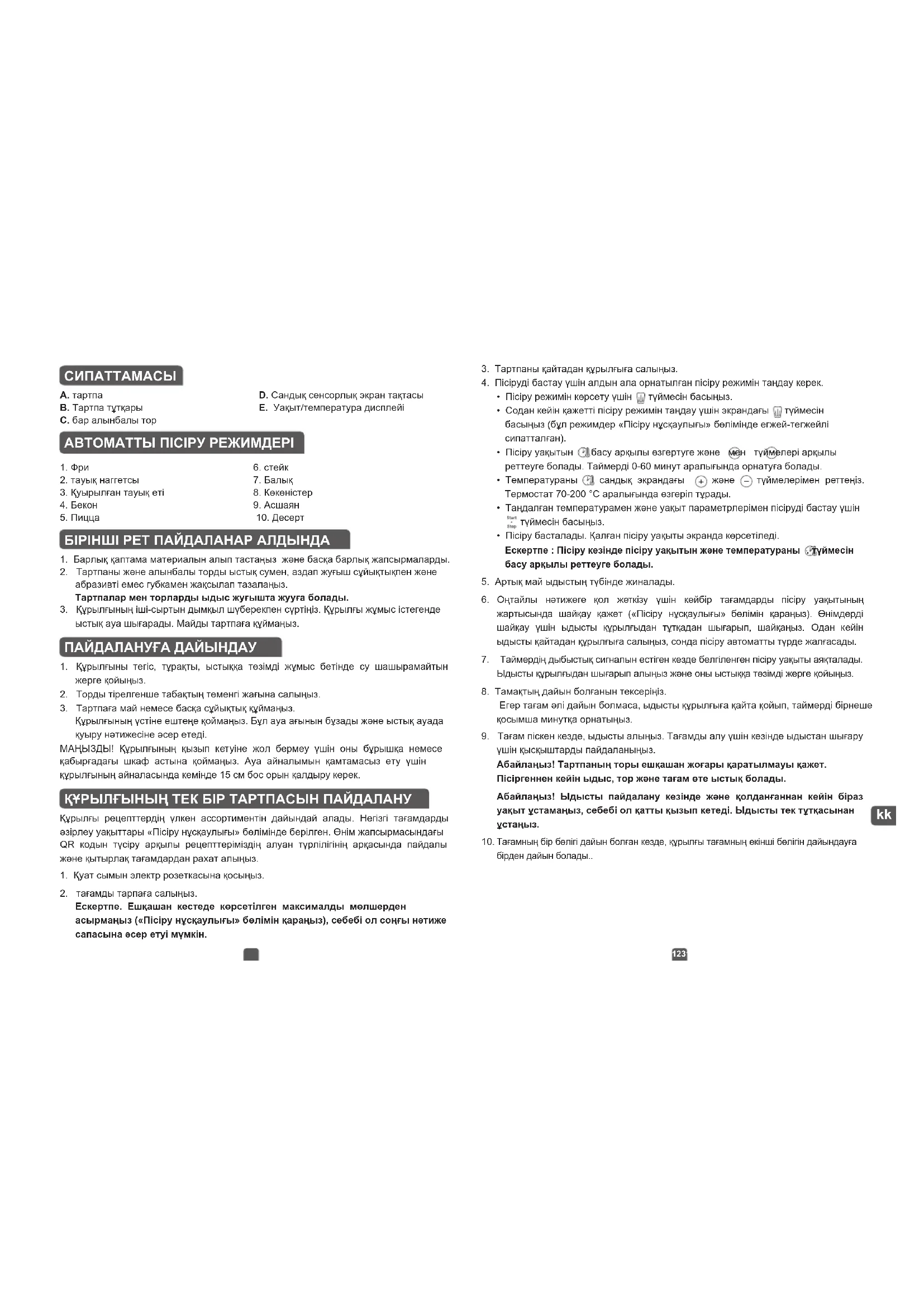 СИПАТТАМАСЫ A. тартпа B. Тартпа тұтқары C. бар алынбалы тор D. Сандық сенсорлық экран тақтасы E. Уақыт/температура дисплейі АВТОМАТТЫ ПІСІРУ РЕЖИМДЕРІ