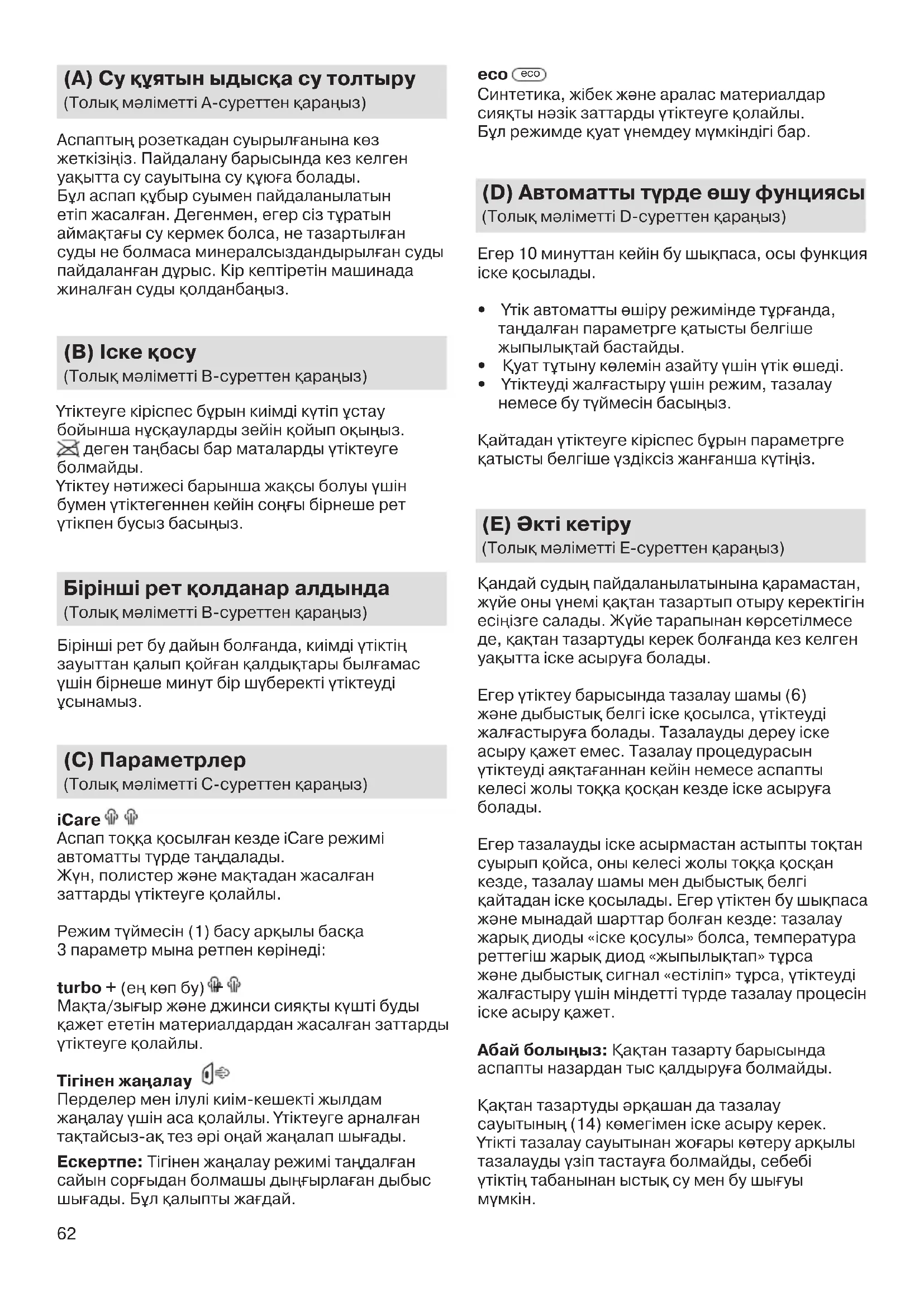 (C) Параметрлер (Толы мðліметті C-суреттен араыз) iCare Аспап тоа осыл¡ан кезде iCare режимі автоматты трде тадалады. Жн, полистер жðне матадан жасал¡ан заттарды тіктеуге олайлы. Режим тймесін (1) басу арылы баса 3 параметр мына ретпен крінеді: turbo + (е кп бу) + Мата/зы¡ыр жðне джинси сияты кшті буды ажет ететін материалдардан жасал¡ан заттарды тіктеуге олайлы. Тігінен жа¡алау Перделер мен ілулі киім-кешекті жылдам жаалау шін аса олайлы. ÷тіктеуге арнал¡ан татайсыз-а тез ðрі оай жаалап шы¡ады. Ескертпе: Тігінен жаалау режимі тадал¡ан сайын сор¡ыдан болмашы ды¡ырла¡ан дыбыс шы¡ады. Бл алыпты жа¡дай. eco eco Синтетика, жібек жðне аралас материалдар сияты нðзік заттарды тіктеуге олайлы. Бл режимде уат немдеу ммкіндігі бар. (D) Автоматты т¶рде ·шу фунциясы (Толы мðліметті D-суреттен араыз) Егер 10 минуттан кейін бу шыпаса, осы функция іске осылады.