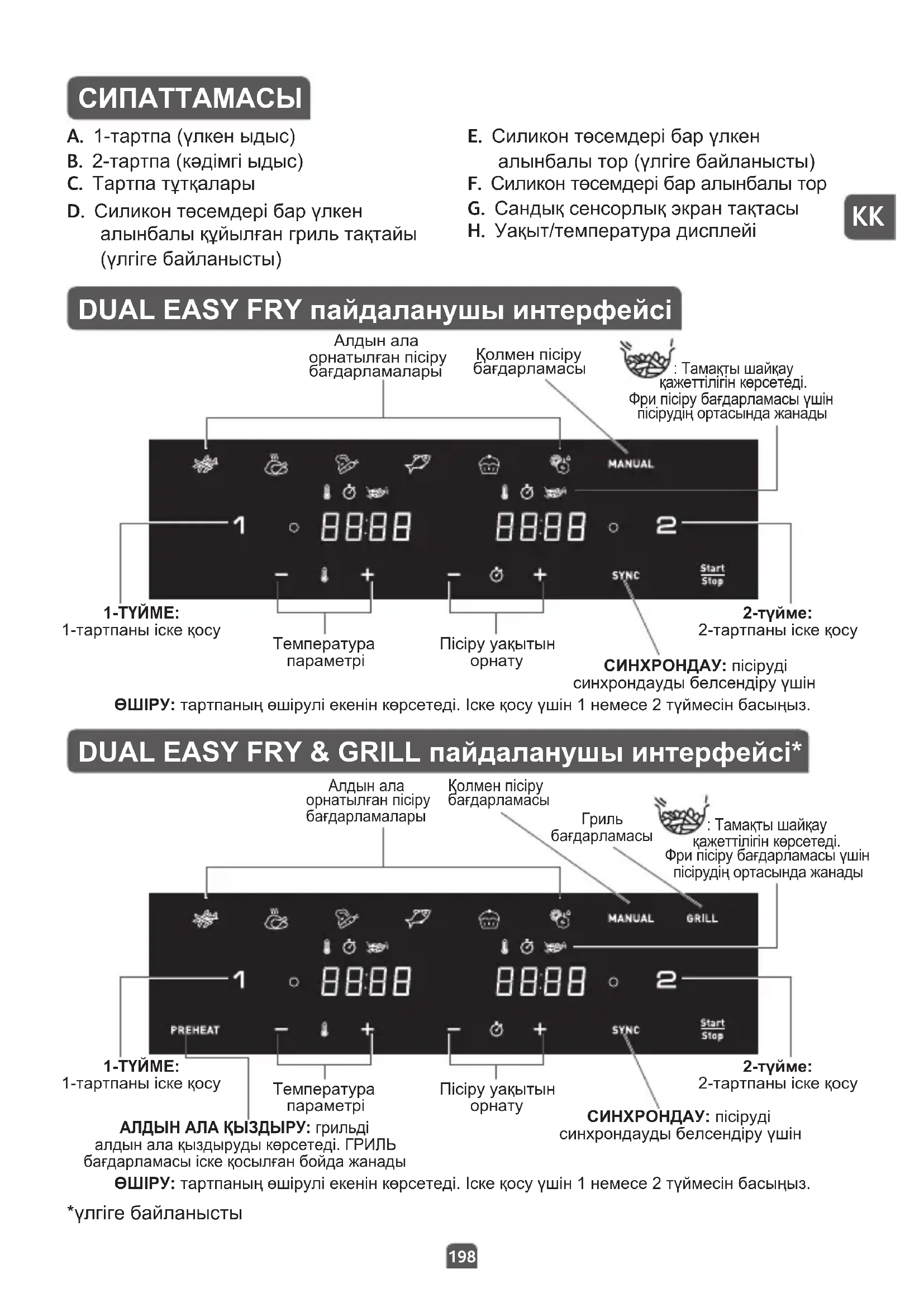 СИПАТТАМАСЫ A. 1-тартпа (үлкен ыдыс) B. 2-тартпа (кәдімгі ыдыс) C. Тартпа тұтқалары D. Силикон төсемдері бар үлкен алынбалы құйылған гриль тақтайы (үлгіге байланысты) E. Силикон төсемдері бар үлкен алынбалы тор (үлгіге байланысты) F. Силикон төсемдері бар алынбалы тор G. Сандық сенсорлық экран тақтасы H. Уақыт/температура дисплейі DUAL EASY FRY пайдаланушы интерфейсі DUAL EASY FRY & GRILL пайдаланушы интерфейсі* ӨШІРУ: тартпаның өшірулі екенін көрсетеді. Іске қосу үшін 1 немесе 2 түймесін басыңыз. ӨШІРУ: тартпаның өшірулі екенін көрсетеді. Іске қосу үшін 1 немесе 2 түймесін басыңыз. АЛДЫН АЛА ҚЫЗДЫРУ: грильді алдын ала қыздыруды көрсетеді. ГРИЛЬ бағдарламасы іске қосылған бойда жанады *үлгіге байланысты