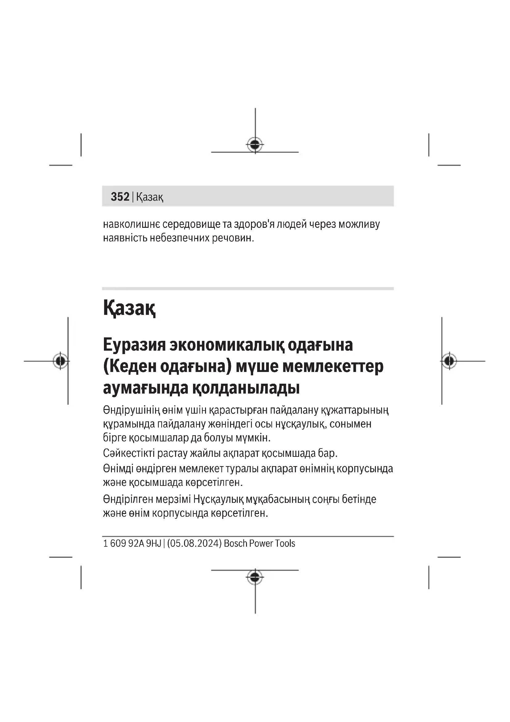 Еуразия экономикалық одағына (Кеден одағына) мүше мемлекеттер аумағында қолданылады Өндірушінің өнім үшін қарастырған пайдалану құжаттарының құрамында пайдалану жөніндегі осы нұсқаулық, сонымен бірге қосымшалар да болуы мүмкін. Сəйкестікті растау жайлы ақпарат қосымшада бар. Өнімді өндірген мемлекет туралы ақпарат өнімнің корпусында жəне қосымшада көрсетілген. Өндірілген мерзімі Нұсқаулық мұқабасының соңғы бетінде және өнім корпусында көрсетілген. 1 609 92A 9HJ | (05.08.2024) Bosch Power ToolsҚазақ | 353 Импортерге қатысты байланыс ақпарат өнім қаптамасында көрсетілген. Өнімді пайдалану мерзімі Өнімнің қызмет ету мерзімі 7 жыл. Өндірілген мерзімнен бастап (өндіру күні зауыт тақтайшасында жазылған) істетпей 5 жыл сақтағаннан соң, өнімді тексерусіз (сервистік тексеру) пайдалану ұсынылмайды. Қызметкер немесе пайдаланушының қателіктері мен істен шығу себептерінің тізімі – өнім корпусынан тікелей түтін шықса, пайдаланбаңыз – жауын –шашын кезінде сыртта (далада) пайдаланбаңыз – корпус ішіне су кірсе құрылғыны қосушы болмаңыз Шекті күй белгілері – өнім корпусының зақымдалуы Қызмет көрсету түрі мен жиілігі Әр пайдаланудан соң өнімді тазалау ұсынылады.