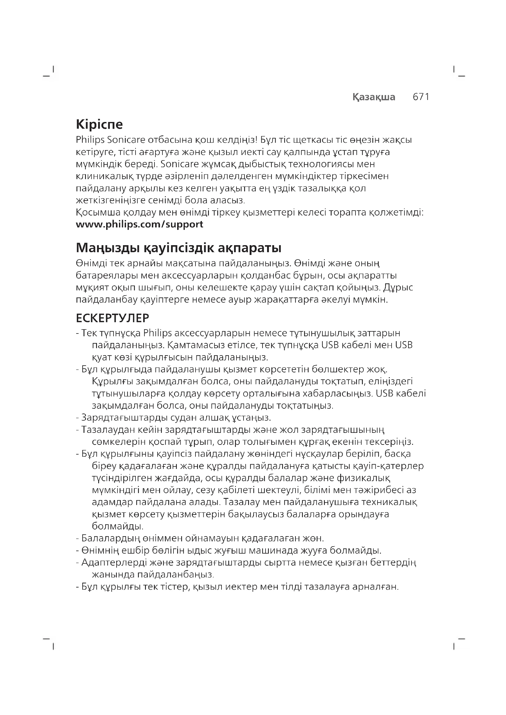 - Балалардың өніммен ойнамауын қадағалаған жөн. - Өнімнің ешбір бөлігін ыдыс жуғыш машинада жууға болмайды. - Адаптерлерді және зарядтағыштарды сыртта немесе қызған беттердің жанында пайдаланбаңыз. - Бұл құрылғы тек тістер, қызыл иектер мен тілді тазалауға арналған.672