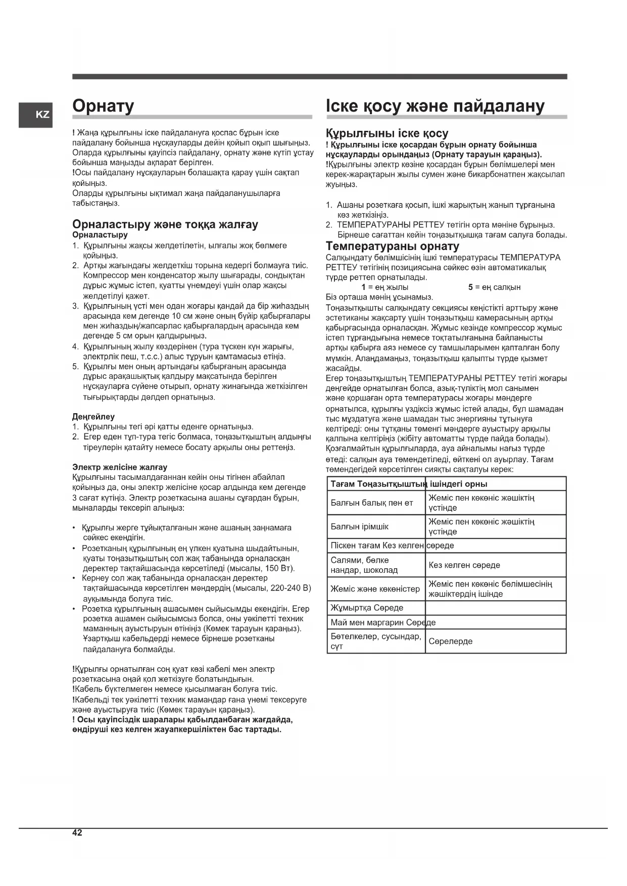 - Бұл құрылғы тұрмыста, үйдің ішінде пайдалануға арналған және коммерциялық немесе өнеркәсіптік мақсатта пайдалануға арналмаған.• Бұл құрылғыны және осы нұсқаулықтағы нұсқауларға сәйкес тағам сақтау мен мұздату үшін тек ересек адамдар ғана пайдалануға тиісl.• Бұл құрылғыны үйдің сыртында, тіпті үсті жабық аймақтарда да орнатуға болмайды. Құрылғыны жаңбыр мен жел астында қалдыру аса қауіпті болып табылады.• Құрылғыға жалаң аяғыңызды тигізуге не су қолмен ұстауға және су аяқ тигізуге болмайды.• Ішіндегі салқындатқыш элементтерге тимеңіз: бұл терінің жыртылуына немесе қыраудан/мұздан үсіп кетуіне себеп болуы мүмкін.• Құрылғыны электр желісінен ағытқан кезде әрқашан электр розеткасынан сымынан емес, ашасынан ұстап суырыңыз.• Тазалау және күтім жасау жұмыстардың алдында, құрылғыны міндетті түрде өшіріңіз және қуат көзінен ажыратқының тексеріңіз. Барлық электрлік контактілерді жою үшін температура реттегіштерін (құрылғыны өшіру) орнату жеткіліксіз.• Дұрыс жұмыс істемеген жағдайда, ешқашан да құрылғыны өз бетіңізбен жөндеуге әрекет жасауға болмайды. Тәжірибесі жоқ адамдар жүргізген жөндеу жұмыстары жарақатқа немесе құрылғының одан бетер бұзылуына себеп болуы мүмкін.• Мұздаған тағам сақталатын бөлімшелерде өндіруші ұсынатын құрал-сайманнан басқа ешқандай өткір немесе үшкір құралдар мен электр жабдығын пайдалануға болмайды.• Мұздатқыштан тікелей алынған мұз текшелерін ауызға салуға болмайды.• Кемтар, ақыл-есі кем немесе тәжірибесі мен білімі жоқ адамдарды (соның ішінде балаларды) олардың қауіпсіздігі үшін жауап беретін адам қадағаламаса немесе пайдалану туралы нұсқау бермесе, бұл құрылғы олардың пайдалануына арналмаған. Балалар құрылғымен ойнамауы үшін оларды қадағалап жүру қажет.• Қаптама материалдарын балалардың қолы жетпейтін жерде сақтаңыз! Олар қақалып немесе тұншығып қалу қатерін төндіруі мүмкін.KZ