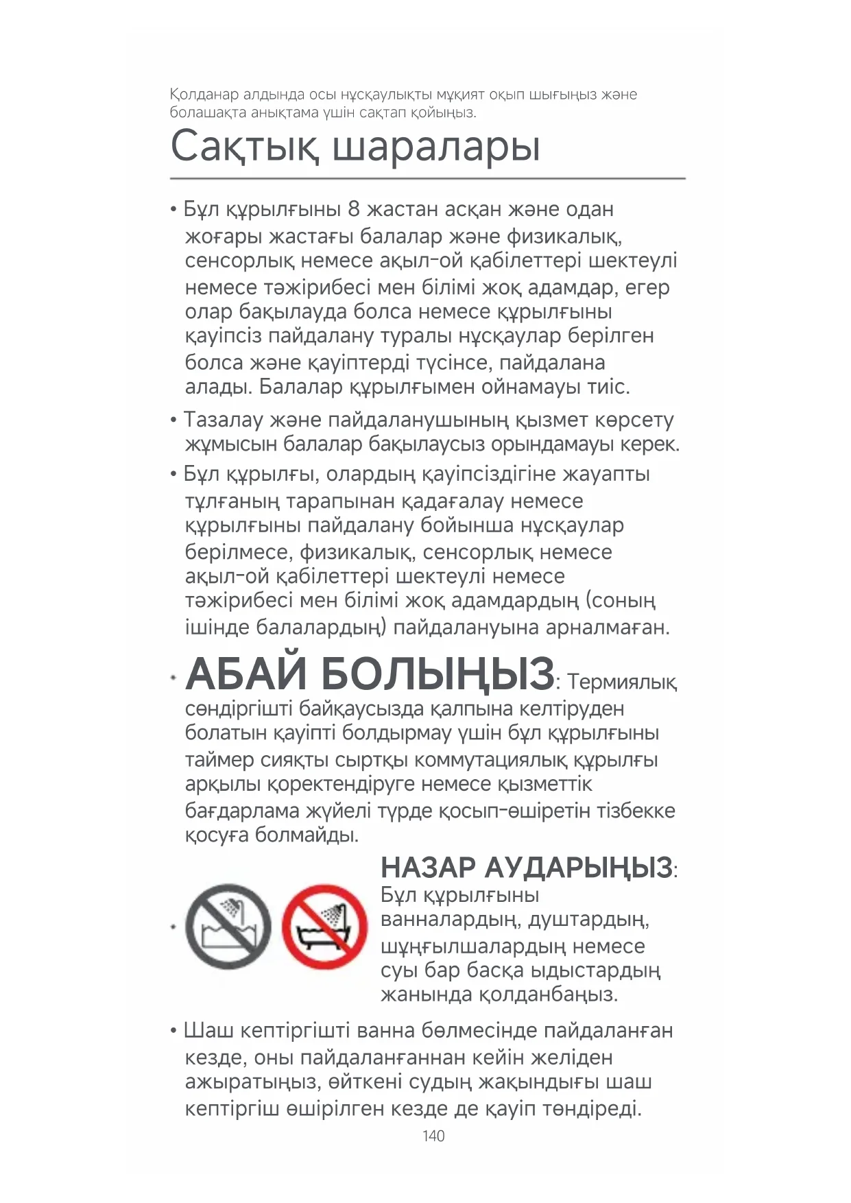 - Бұл құрылғыны 8 жастан асқан және одан жоғары жастағы балалар және физикалық, сенсорлық немесе ақыл-ой қабілеттері шектеулі немесе тәжірибесі мен білімі жоқ адамдар, егер олар бақылауда болса немесе құрылғыны қауіпсіз пайдалану туралы нұсқаулар берілген болса және қауіптерді түсінсе, пайдалана алады. Балалар құрылғымен ойнамауы тиіс.