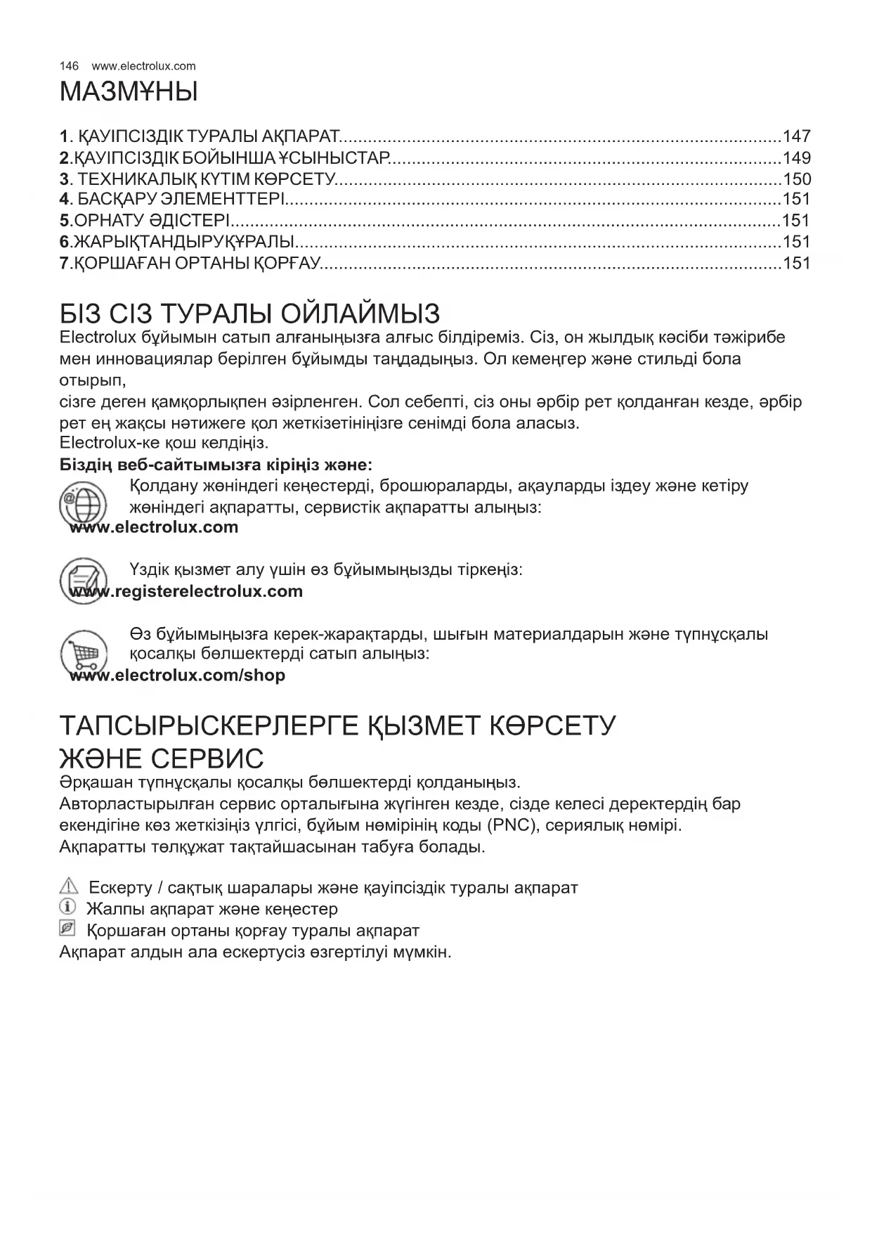 сізге деген қамқорлықпен əзірленген. Сол себепті, сіз оны əрбір рет қолданған кезде, əрбір рет ең жақсы нəтижеге қол жеткізетініңізге сенімді бола аласыз. Electrolux-ке қош келдіңіз. Біздің веб-сайтымызға кіріңіз жəне: Қолдану жөніндегі кеңестерді, брошюраларды, ақауларды іздеу жəне кетіру жөніндегі ақпаратты, сервистік ақпаратты алыңыз: www.electrolux.com Үздік қызмет алу үшін өз бұйымыңызды тіркеңіз: www.registerelectrolux.com Өз бұйымыңызға керек-жарақтарды, шығын материалдарын жəне түпнұсқалы қосалқы бөлшектерді сатып алыңыз: www.electrolux.com/shop ТАПСЫРЫСКЕРЛЕРГЕ ҚЫЗМЕТ КӨРСЕТУ ЖƏНЕ СЕРВИС Əрқашан түпнұсқалы қосалқы бөлшектерді қолданыңыз. Авторластырылған сервис орталығына жүгінген кезде, сізде келесі деректердің бар екендігіне көз жеткізіңіз үлгісі, бұйым нөмірінің коды (PNC), сериялық нөмірі. Ақпаратты төлқұжат тақтайшасынан табуға болады. Ескерту / сақтық шаралары жəне қауіпсіздік туралы ақпарат Жалпы ақпарат жəне кеңестер Қоршаған ортаны қорғау туралы ақпарат Ақпарат алдын ала ескертусіз өзгертілуі мүмкін.147ҚАЗАҚ