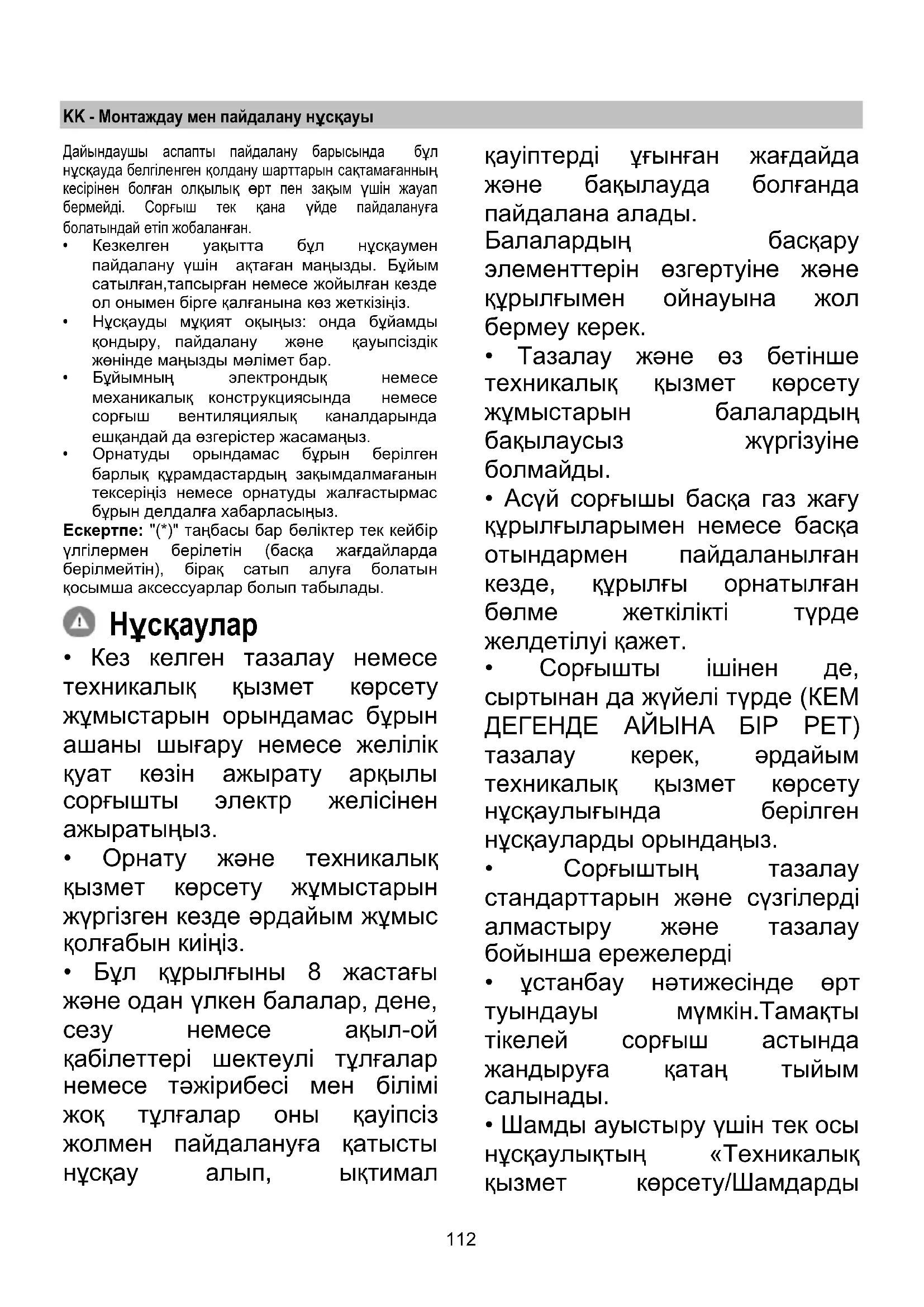 - Бұл құрылғыны 8 жастағы жəне одан үлкен балалар, дене, сезу немесе ақыл-ой қабілеттері шектеулі тұлғалар немесе тəжірибесі мен білімі жоқ тұлғалар оны қауіпсіз жолмен пайдалануға қатысты нұсқау алып, ықтимал қауіптерді ұғынған жағдайда жəне бақылауда болғанда пайдалана алады. Балалардың басқару элементтерін өзгертуіне жəне құрылғымен ойнауына жол бермеу керек.