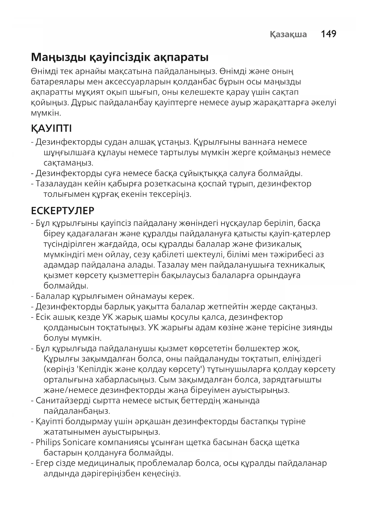 - Балалар құрылғымен ойнамауы керек. - Дезинфекторды барлық уақытта балалар жетпейтін жерде сақтаңыз. - Есік ашық кезде УК жарық шамы қосулы қалса, дезинфектор қолданысын тоқтатыңыз. УК жарығы адам көзіне және терісіне зиянды болуы мүмкін. - Бұл құрылғыда пайдаланушы қызмет көрсететін бөлшектер жоқ. Құрылғы зақымдалған болса, оны пайдалануды тоқтатып, еліңіздегі (көріңіз 'Кепілдік және қолдау көрсету') тұтынушыларға қолдау көрсету орталығына хабарласыңыз. Сым зақымдалған болса, зарядтағышты және/немесе дезинфекторды жаңа біреуімен ауыстырыңыз. - Санитайзерді сыртта немесе ыстық беттердің жанында пайдаланбаңыз. - Қауіпті болдырмау үшін әрқашан дезинфекторды бастапқы түріне жататынымен ауыстырыңыз. - Philips Sonicare компаниясы ұсынған щетка басынан басқа щетка бастарын қолдануға болмайды. - Егер сізде медициналық проблемалар болса, осы құралды пайдаланар алдында дәрігеріңізбен кеңесіңіз.150