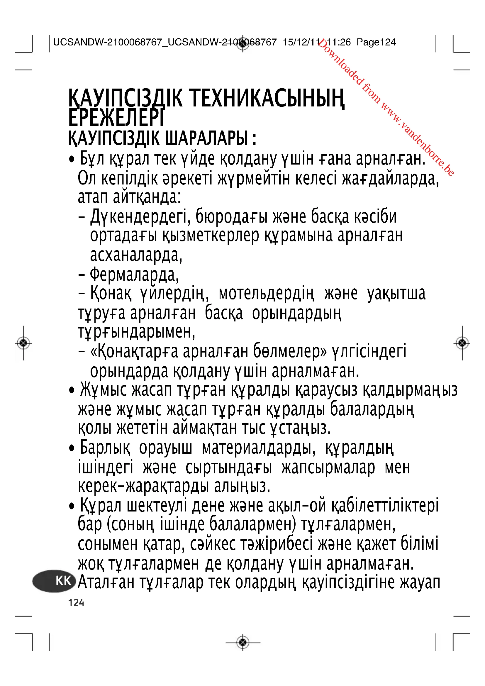 UCSANDW-2100068767_UCSANDW-2100068767 15/12/11 11:26 Page124 Downloaded from www.vandenborre.be125 беретін тұлғалардың қадағалауымен немесе оны қолдану бойынша нұсқаулар алғаннан кейін ғана осы құралды қолдана алады. Балалардың құралмен ойнамауын қадағалаңыз.