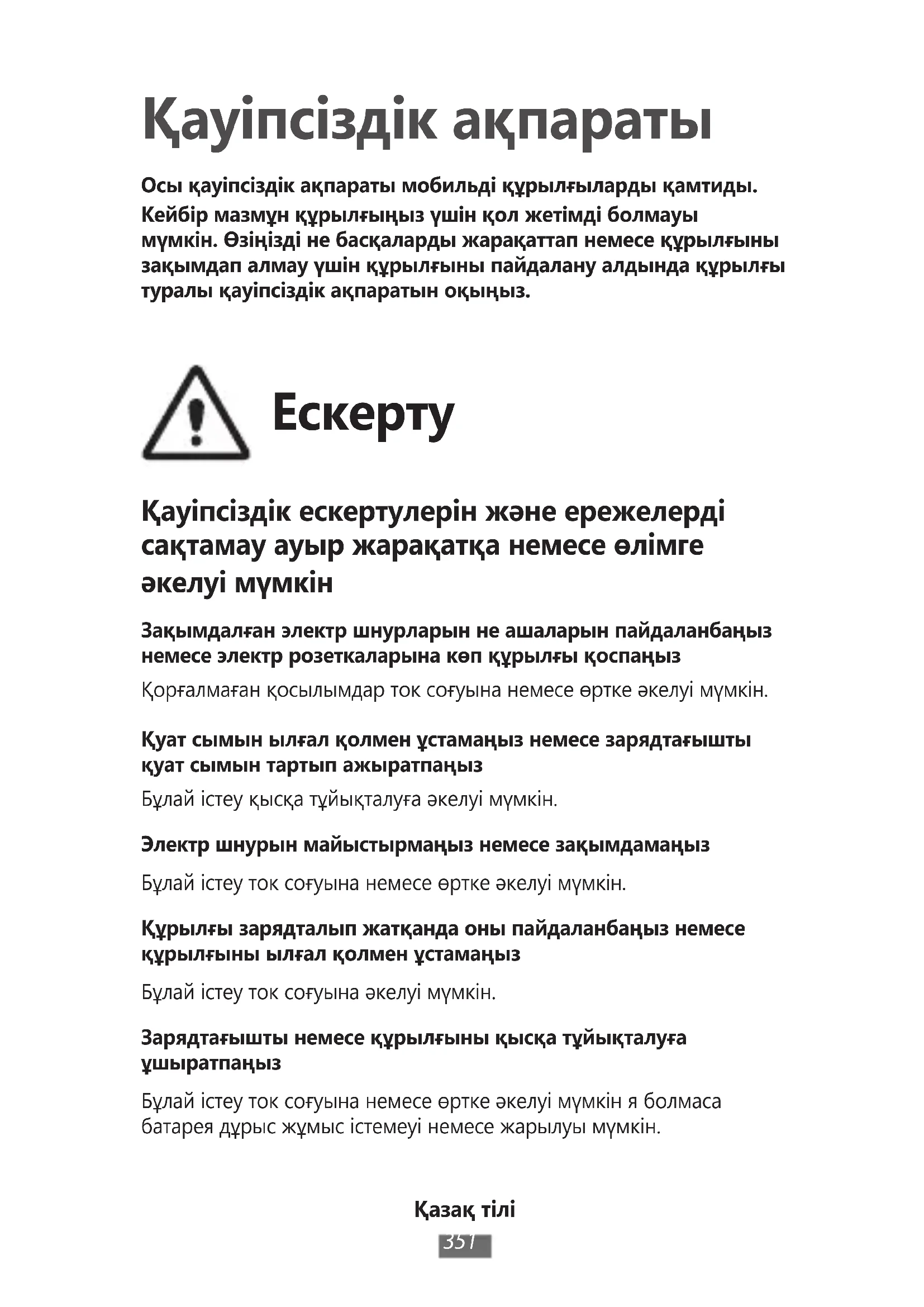 Қауіпсіздік ескертулерін және ережелерді сақтамау ауыр жарақатқа немесе өлімге әкелуі мүмкін Зақымдалған электр шнурларын не ашаларын пайдаланбаңыз немесе электр розеткаларына көп құрылғы қоспаңызҚорғалмаған қосылымдар ток соғуына немесе өртке әкелуі мүмкін.Қуат сымын ылғал қолмен ұстамаңыз немесе зарядтағышты қуат сымын тартып ажыратпаңызБұлай істеу қысқа тұйықталуға әкелуі мүмкін.Электр шнурын майыстырмаңыз немесе зақымдамаңызБұлай істеу ток соғуына немесе өртке әкелуі мүмкін.Құрылғы зарядталып жатқанда оны пайдаланбаңыз немесе құрылғыны ылғал қолмен ұстамаңызБұлай істеу ток соғуына әкелуі мүмкін.Зарядтағышты немесе құрылғыны қысқа тұйықталуға ұшыратпаңызБұлай істеу ток соғуына немесе өртке әкелуі мүмкін я болмаса батарея дұрыс жұмыс істемеуі немесе жарылуы мүмкін.Қазақ тілі
