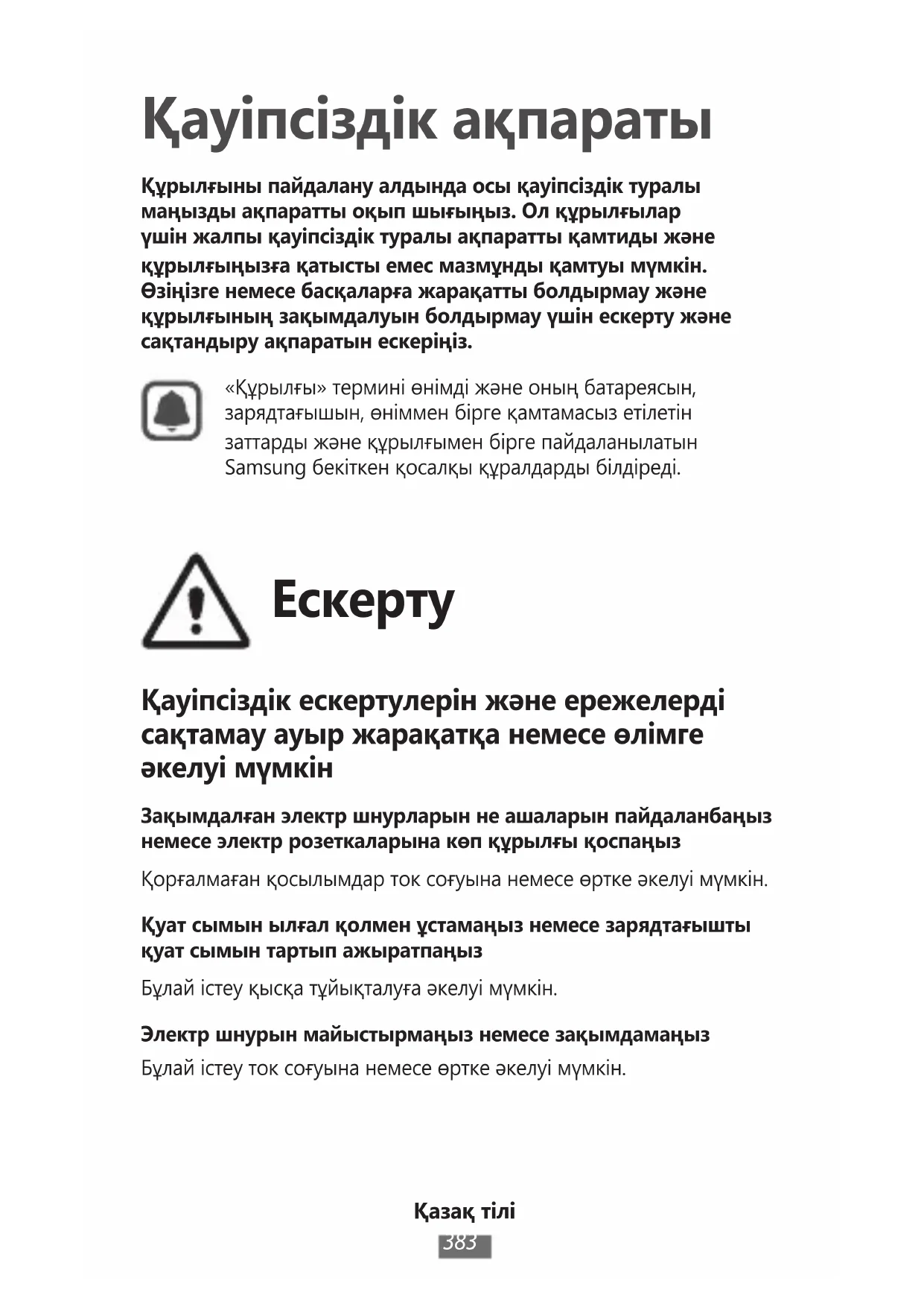 Қауіпсіздік ақпараты Құрылғыны пайдалану алдында осы қауіпсіздік туралы маңызды ақпаратты оқып шығыңыз. Ол құрылғылар үшін жалпы қауіпсіздік туралы ақпаратты қамтиды және құрылғыңызға қатысты емес мазмұнды қамтуы мүмкін. Өзіңізге немесе басқаларға жарақатты болдырмау және құрылғының зақымдалуын болдырмау үшін ескерту және сақтандыру ақпаратын ескеріңіз.«Құрылғы» термині өнімді және оның батареясын, зарядтағышын, өніммен бірге қамтамасыз етілетін заттарды және құрылғымен бірге пайдаланылатын Samsung бекіткен қосалқы құралдарды білдіреді.