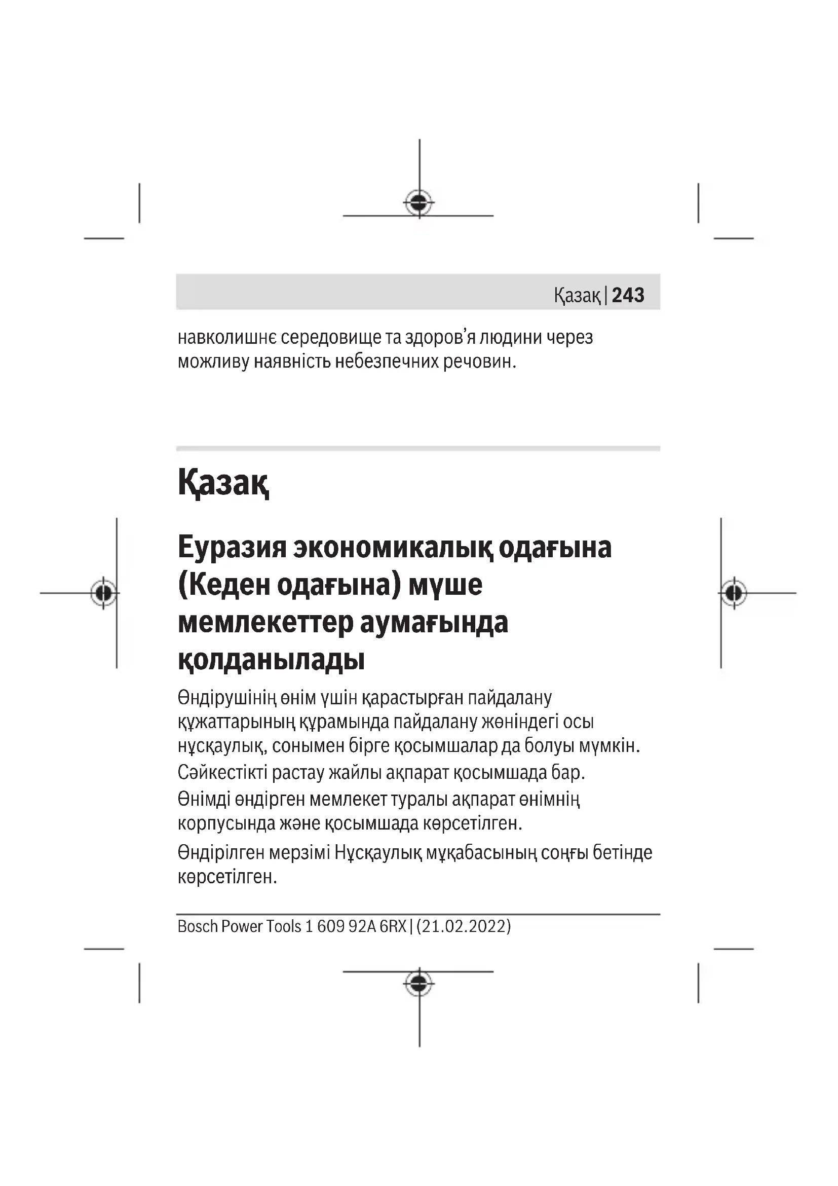 Еуразия экономикалық одағына (Кеден одағына) мүше мемлекеттер аумағында қолданылады Өндірушінің өнім үшін қарастырған пайдалану құжаттарының құрамында пайдалану жөніндегі осы нұсқаулық, сонымен бірге қосымшалар да болуы мүмкін. Сəйкестікті растау жайлы ақпарат қосымшада бар. Өнімді өндірген мемлекет туралы ақпарат өнімнің корпусында жəне қосымшада көрсетілген. Өндірілген мерзімі Нұсқаулық мұқабасының соңғы бетінде көрсетілген. Bosch Power Tools 1 609 92A 6RX | (21.02.2022)244 | Қазақ Импортерге қатысты байланыс ақпарат өнім қаптамасында көрсетілген. Өнімді пайдалану мерзімі Өнімнің қызмет ету мерзімі 7жыл. Өндірілген мерзімнен бастап (өндіру күні зауыт тақтайшасында жазылған) істетпей 5жыл сақтағаннан соң, өнімді тексерусіз (сервистік тексеру) пайдалану ұсынылмайды. Көрсетілген қызмет ету мерзімі тұтынушы аталмыш нұсқаулықтың талаптарын орындаған жағдайда ғана жарамды болады. Iстен шығу себептерінің тізімі – қөп үшқын шықса, пайдаланбаңыз – қатты діріл кезінде пайдаланбаңыз – тоқ сымы бұзылған немесе оқшаулаусыз болса, пайдаланбаңыз – өнім корпусынан тікелей түтін шықса, пайдаланбаңыз Пайдаланушының мүмкін қателіктері – тұтқасы мен корпусы бұзылған болса, өнімді пайдаланбаңыз – жауын –шашын кезінде сыртта пайдаланбаңыз – корпус ішіне су кірсе құрылғыны қосушы болмаңыз 1 609 92A 6RX | (21.02.2022) Bosch Power ToolsҚазақ | 245 Шекті күй белгілері – тоқ сымының тозуы немесе зақымдануы – өнім корпусының зақымдалуы Қызмет көрсету түрі мен жиілігі – Әр пайдаланудан соң өнімді тазалау ұсынылады.