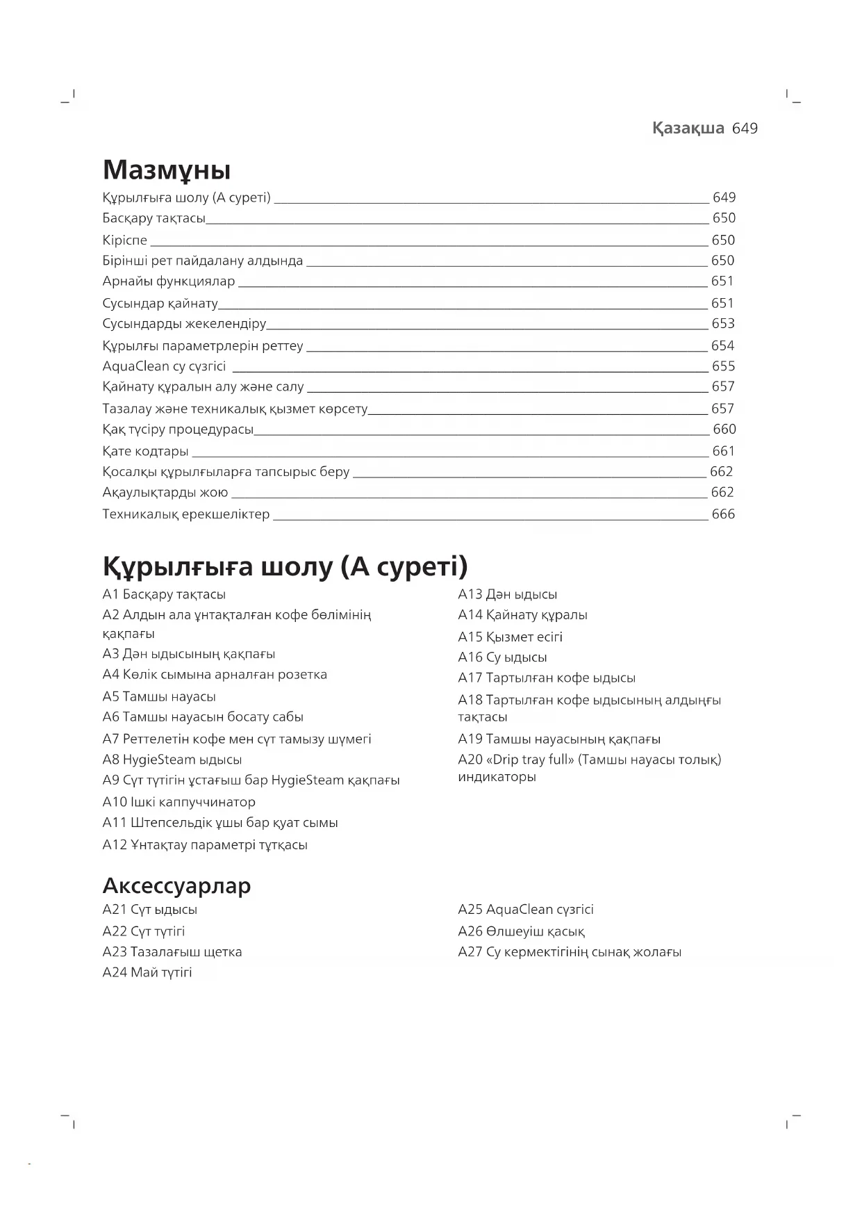 Құрылғыға шолу (A суреті) ________________________________________________________________ 649 Басқару тақтасы__________________________________________________________________________ 650 Кіріспе __________________________________________________________________________________ 650 Бірінші рет пайдалану алдында ___________________________________________________________ 650 Арнайы функциялар _____________________________________________________________________ 651 Сусындар қайнату________________________________________________________________________ 651 Сусындарды жекелендіру_________________________________________________________________ 653 Құрылғы параметрлерін реттеу ___________________________________________________________ 654 AquaClean су сүзгісі ______________________________________________________________________ 655 Қайнату құралын алу және салу ___________________________________________________________ 657 Тазалау және техникалық қызмет көрсету__________________________________________________ 657 Қақ түсіру процедурасы___________________________________________________________________ 660 Қате кодтары ____________________________________________________________________________ 661 Қосалқы құрылғыларға тапсырыс беру ____________________________________________________ 662 Ақаулықтарды жою ______________________________________________________________________ 662 Техникалық ерекшеліктер ________________________________________________________________ 666 Құрылғыға шолу (A суреті) A1 Басқару тақтасы A2 Алдын ала ұнтақталған кофе бөлімінің