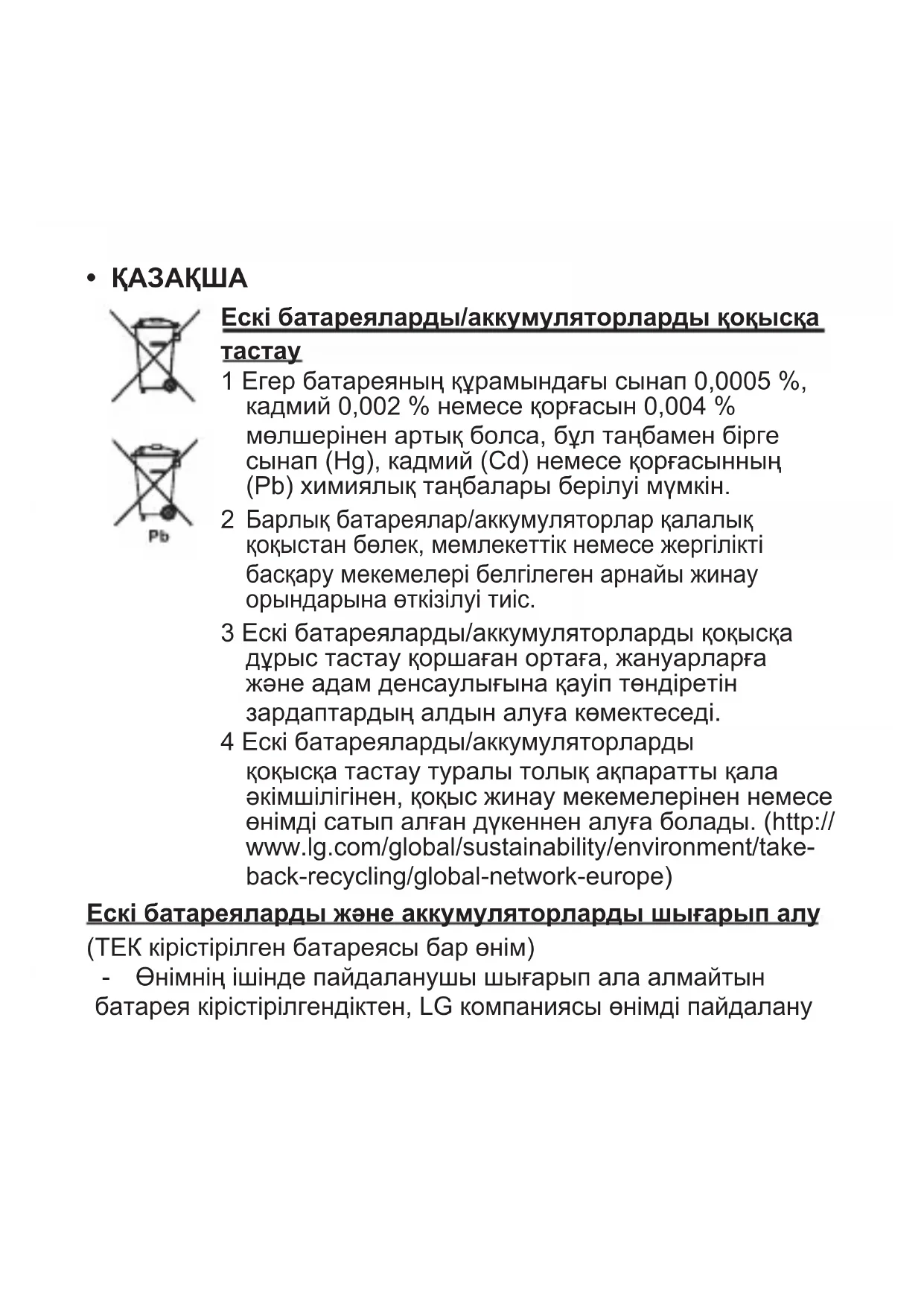 Барлықбатареялар/аккумуляторларқалалық қоқыстанбөлек,мемлекеттікнемесежергілікті басқарумекемелерібелгілегенарнайыжинау орындарынаөткізілуітиіс. 3Ескібатареяларды/аккумуляторлардықоқысқа дұрыстастауқоршағанортаға,жануарларға жәнеадамденсаулығынақауіптөндіретін зардаптардыңалдыналуғакөмектеседі. 4Ескібатареяларды/аккумуляторларды қоқысқатастаутуралытолықақпараттықала әкімшілігінен,қоқысжинаумекемелеріненнемесе өнімдісатыпалғандүкенненалуғаболады.(http:// www.lg.com/global/sustainability/environment/take- back-recycling/global-network-europe) Ескі батареяларды және аккумуляторларды шығарып алу (ТЕКкірістірілгенбатареясыбарөнім) - Өнімніңішіндепайдаланушышығарыпалаалмайтын батареякірістірілгендіктен,LGкомпаниясыөнімдіпайдаланумерзіміаяқталғандаоныалмастырунемесеқайтаөңдеу үшінбатареянытекбіліктімаманныңшығарыпалуынакеңес береді.Өнімдізақымдапалмасүшінжәнеөзқауіпсіздігіүшін пайдаланушыбатареянышығарыпалуғатырыспағаныдұрыс жәнеLGServiceHelplineқызметіненемесекөмекалуүшін басқажекеқызметкөрсетупровайдерінехабарласқаныжөн. - Батареяныалуөнімніңкорпусынбөлшектеуді,электр кабельдерін/контактілердіажыратудыжәнебатареяұясын мұқиятшығаруәрекетінқамтиды.Батареянықалайқауіпсіз шығаруәдісітуралыбіліктімамандарғаарналғаннұсқаулар қажетболса,келесівеб-сайтқакіріңіз:http://www.lge.com/ global/sustainability/environment/take-back-recycling