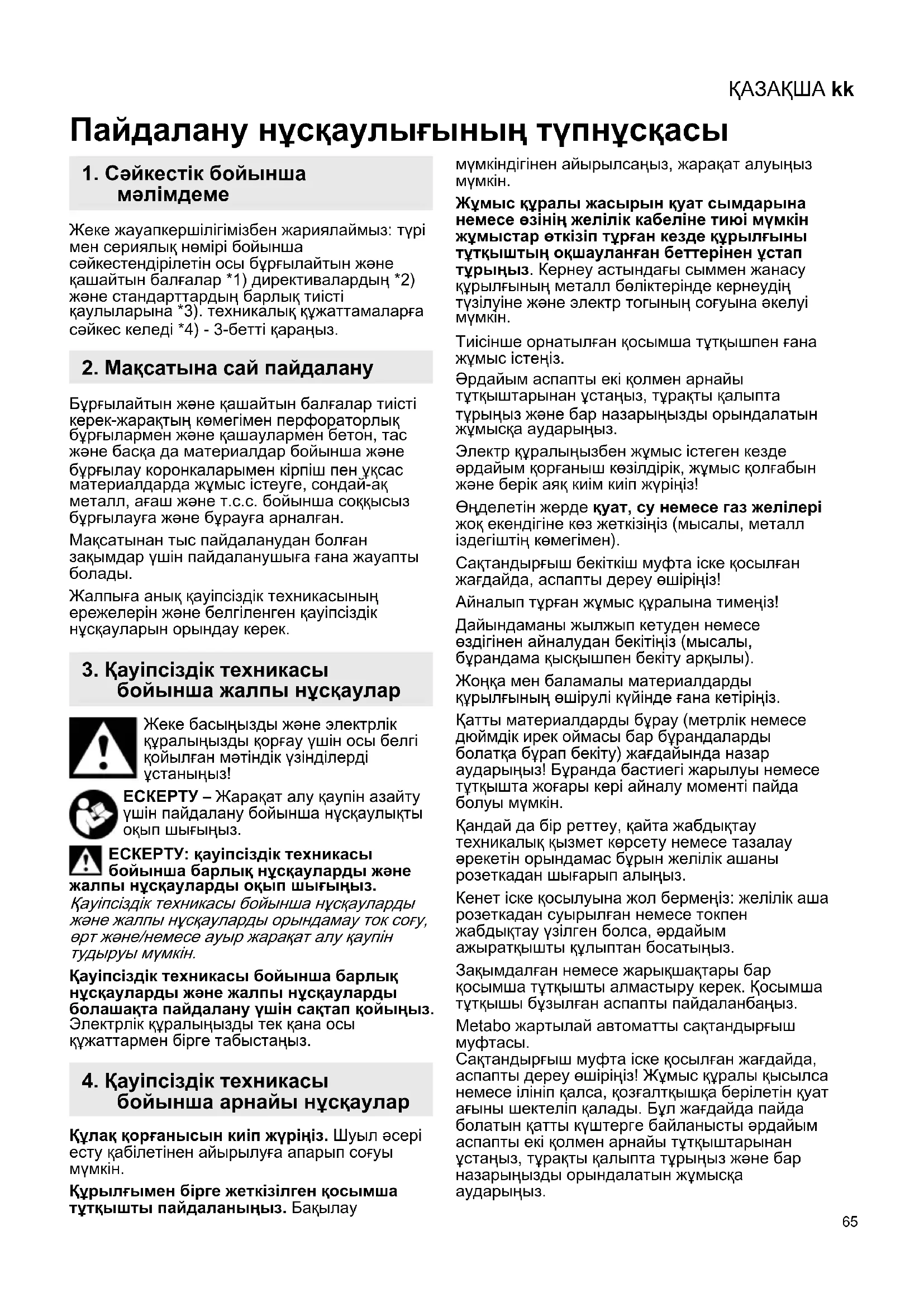 Тиісінше орнатылған қосымша тұтқышпен ғана жұмыс істеңіз. Әрдайым аспапты екі қолмен арнайы тұтқыштарынан ұстаңыз, тұрақты қалыпта тұрыңыз және бар назарыңызды орындалатын жұмысқа аударыңыз. Электр құралыңызбен жұмыс істеген кезде әрдайым қорғаныш көзілдірік, жұмыс қолғабын және берік аяқ киім киіп жүріңіз! Өңделетін жерде қуат, су немесе газ желілері жоқ екендігіне көз жеткізіңіз (мысалы, металл іздегіштің көмегімен). Сақтандырғыш бекіткіш муфта іске қосылған жағдайда, аспапты дереу өшіріңіз! Айналып тұрған жұмыс құралына тимеңіз! Дайындаманы жылжып кетуден немесе өздігінен айналудан бекітіңіз (мысалы, бұрандама қысқышпен бекіту арқылы). Жоңқа мен баламалы материалдарды құрылғының өшірулі күйінде ғана кетіріңіз. Қатты материалдарды бұрау (метрлік немесе дюймдік ирек оймасы бар бұрандаларды болатқа бұрап бекіту) жағдайында назар аударыңыз! Бұранда бастиегі жарылуы немесе тұтқышта жоғары кері айналу моменті пайда болуы мүмкін. Қандай да бір реттеу, қайта жабдықтау техникалық қызмет көрсету немесе тазалау әрекетін орындамас бұрын желілік ашаны розеткадан шығарып алыңыз. Кенет іске қосылуына жол бермеңіз: желілік аша розеткадан суырылған немесе токпен жабдықтау үзілген болса, әрдайым ажыратқышты құлыптан босатыңыз. Зақымдалған немесе жарықшақтары бар қосымша тұтқышты алмастыру керек. Қосымша тұтқышы бұзылған аспапты пайдаланбаңыз. Metabo жартылай автоматты сақтандырғыш